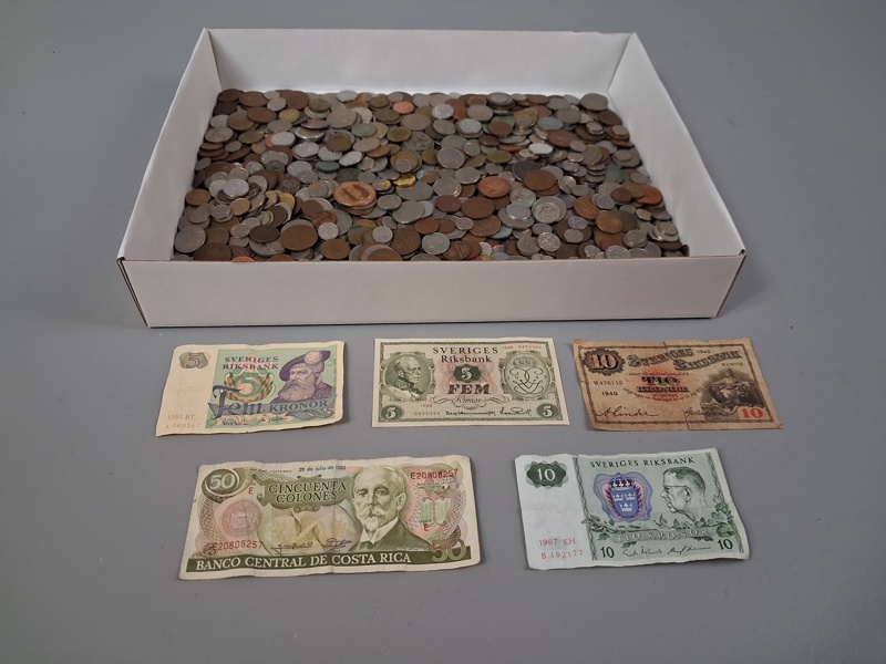 Diverse mynt & några sedlar. Cirka 4,5Kg, Utländska & Svenska.