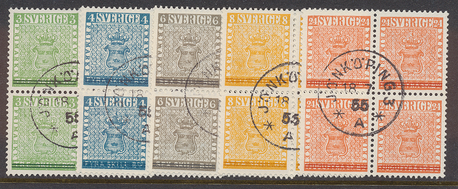 Stockholmia-55. Komplett 9-blockserie, stämplade med rättvänd stämpel 1.7.55 samt dito 4-blockserie stämplade JÖNKÖPING 18.7.55.