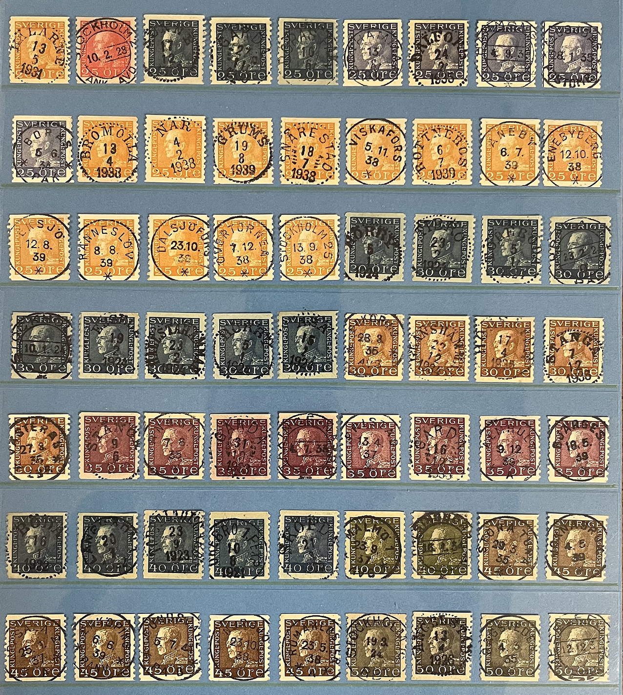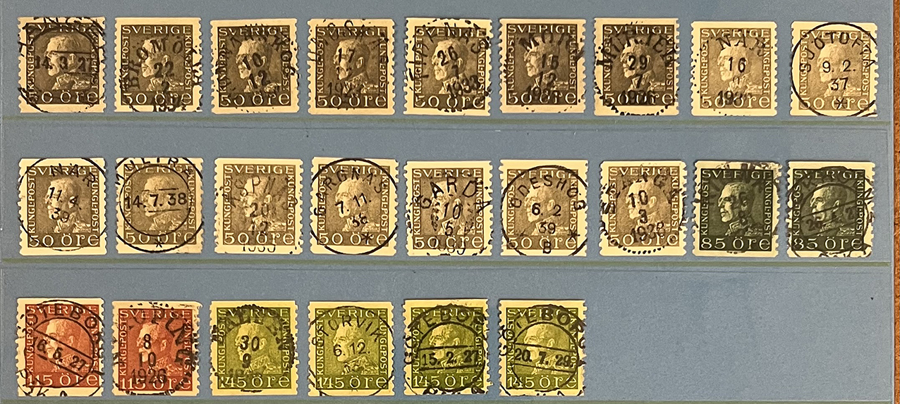Mycket vacker stämplad lot 150 exemplar G V Profil vänster, samtliga valörer ingår och genomgående med rättvända Praktstämplar.