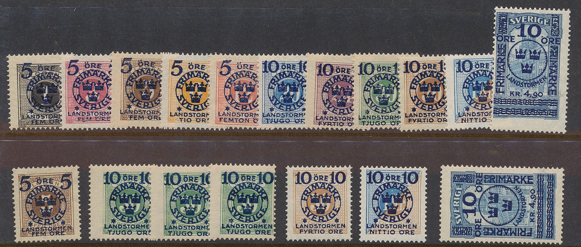 Parti Landstorm II, bl a ostämplad serie, postfrisk 5 kr, olika stämplade valörer mm.