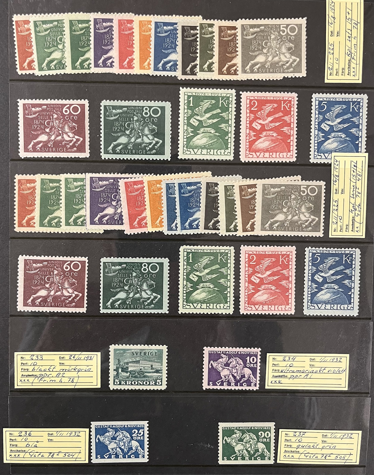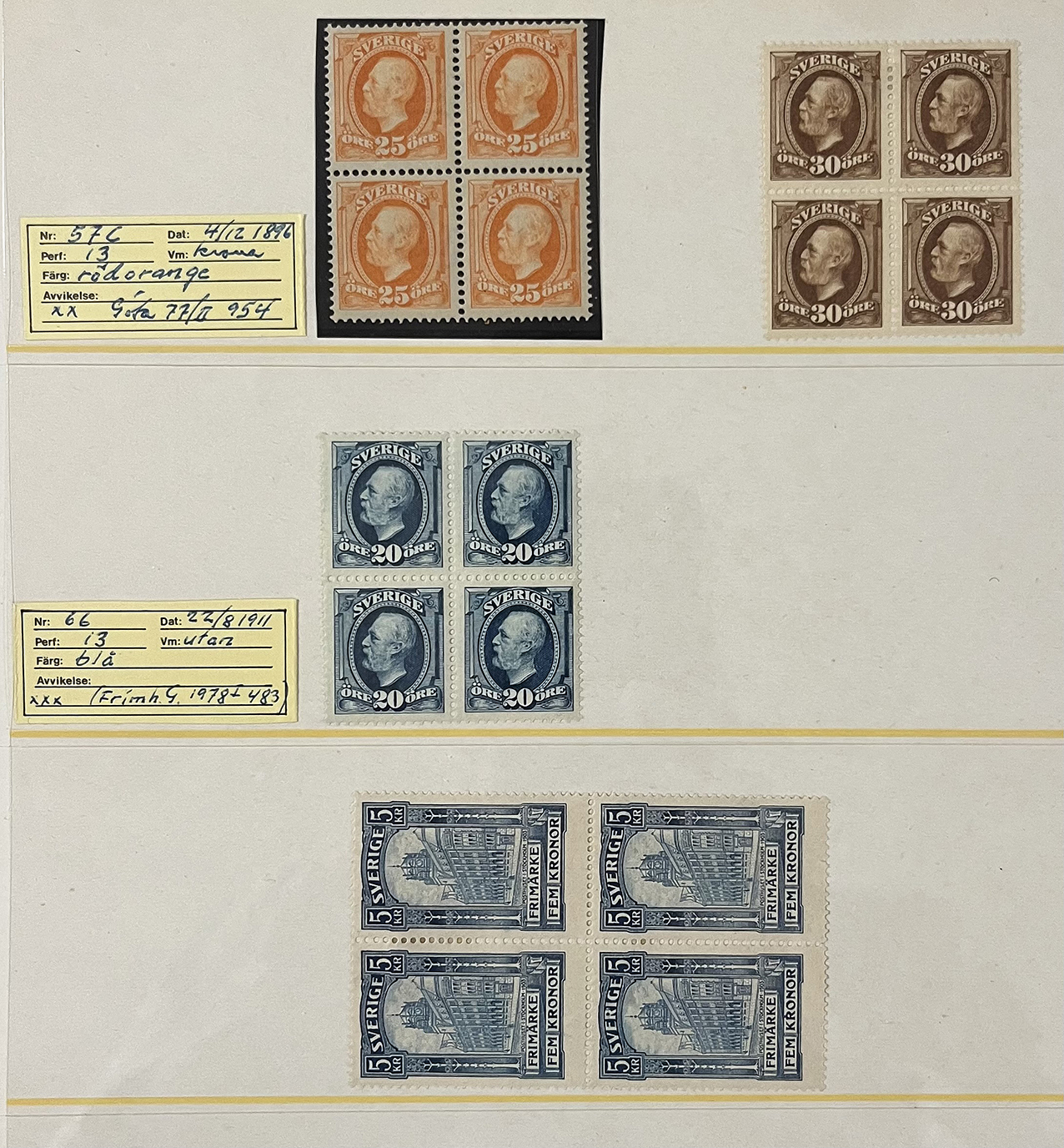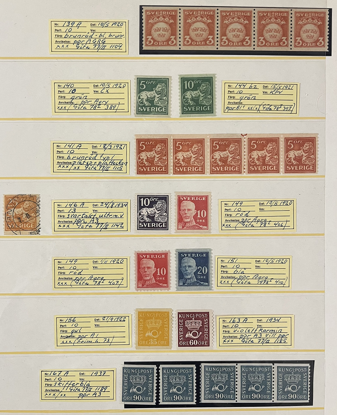 Intressant "samling" med en del Ringtyp, bl a 12 öre i 50-block, 36 ex O II boktryck i singlar, strip och block, vidare O II med 20 öre i otandat par, 50 öre Luftpost med vattenmärke krona, bandmärken, 1924 års serie överkomplett, ett antal BC-häften (alla med blyertsnot) och mycket mer. Rekommenderas till besiktning.