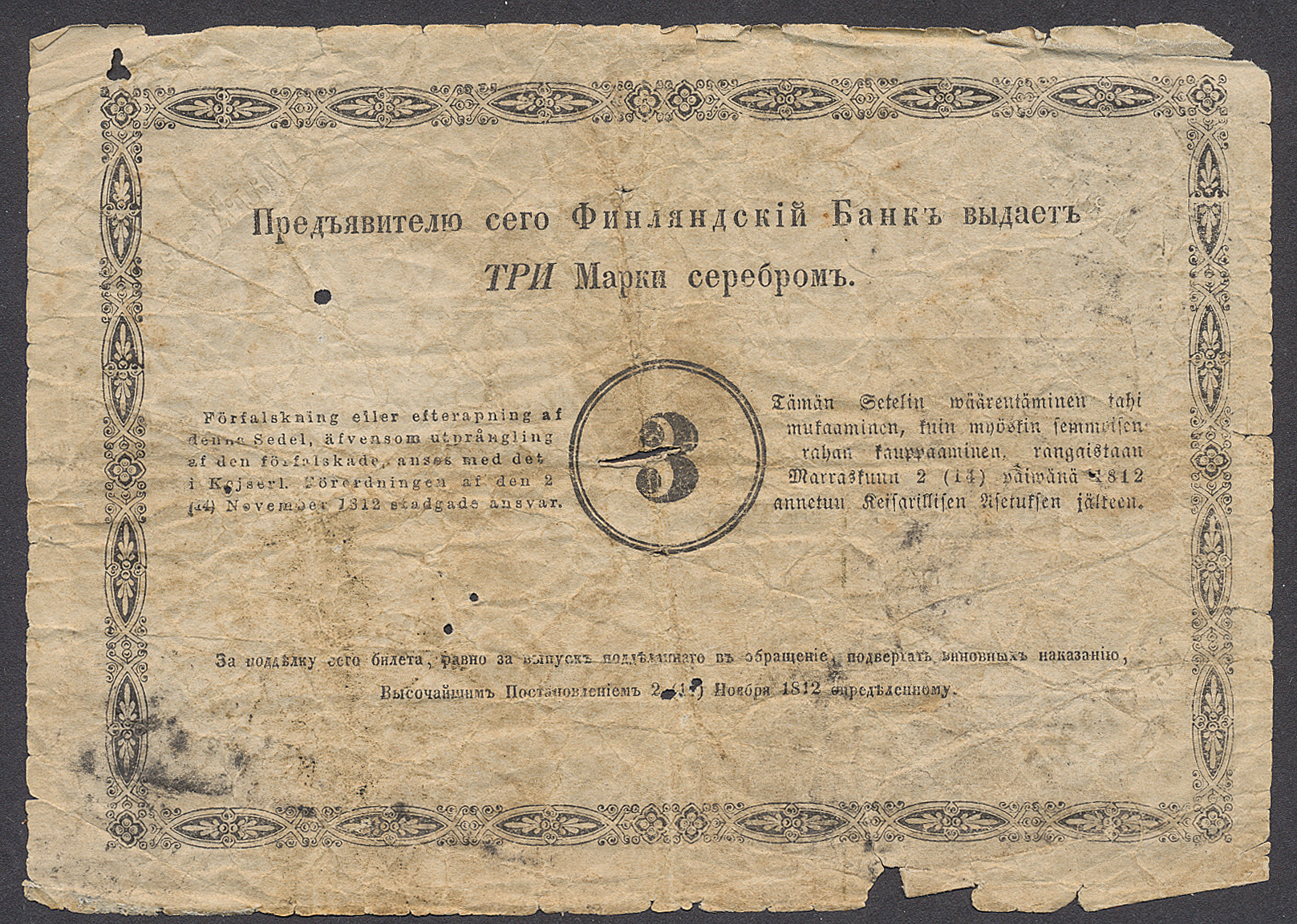 Finland. 3 markkaa 1875, nr 113207. Pick A40e. 2.