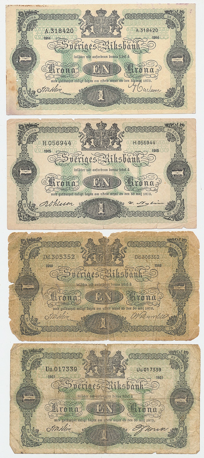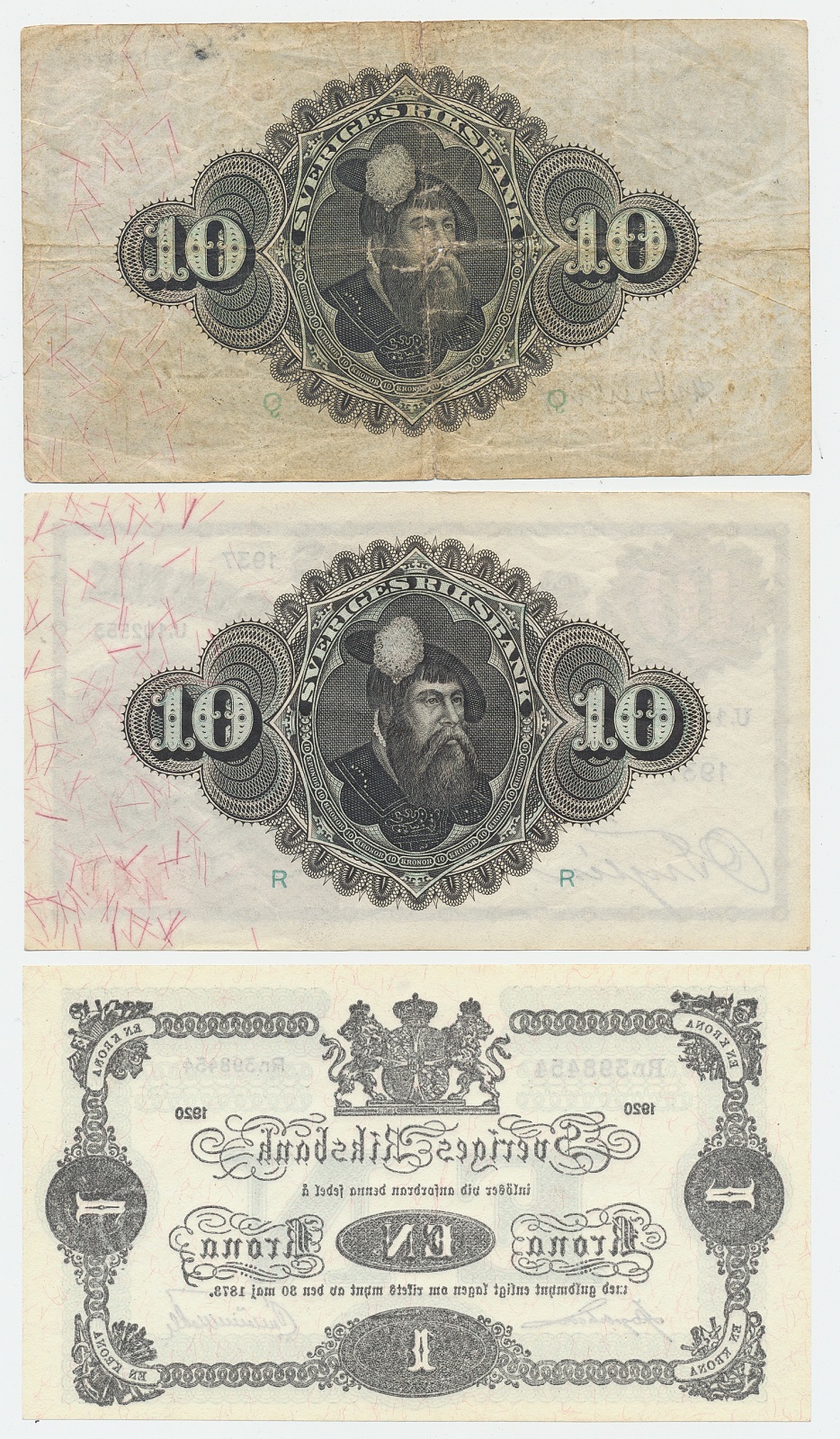 32 sk bco 1858, 10 kr 1916 1 riss, 1937 ovikt samt 1 kr 1920 ovikt och 4 ex 1 kr 1914-21.