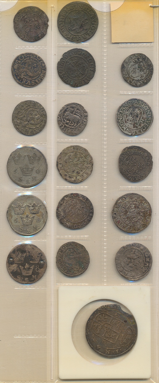 Medeltid-1694. 19 silvermynt, bl a brakteat krönt S, Gotland, Fyrk 1598, 2 öre 1609 gravörstil 2 SM 71b, 1/2 öre 1615 (2 ex) och Mark Karl IX otydligt årtal och kantförlust.