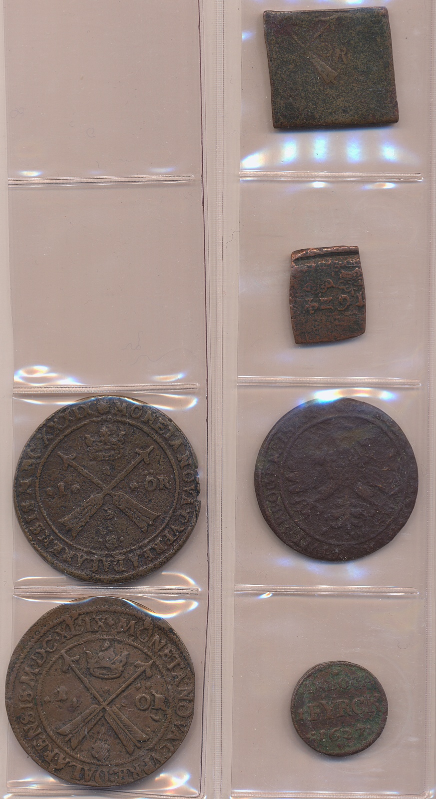 Gustav II Adolf-Kristina. Öre klipping 1625, Fyrk kliiping 1624 typmynt, Arboga Öre 1628 och Fyrk 1627 typmynt samt Öre 1639 och 1649.