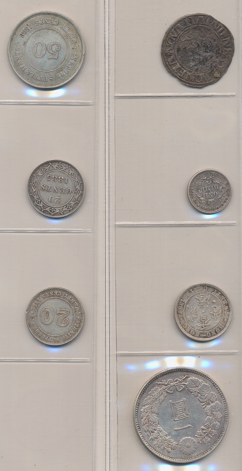 World Coins. 7 coins including Denmark 4 sk 1532 Copenhagen (2,81 grams) corroded, Hawaii 10 c 1883, Hong Kong 20 c 1887, Japan Yen (1888) and Straits Settlements 50 C 1886.