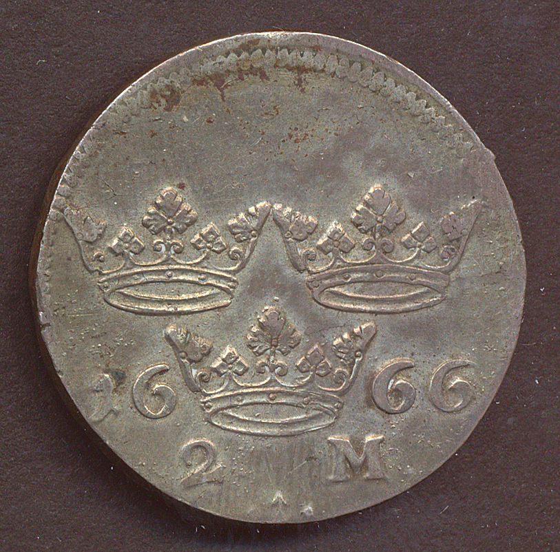 Karl XI. 2 mark 1666, bruten omskrift CAROLUS. REX. SVE., mångveckad mantel och axelflikar, myntmästarmärke pil. Jfr SM 115a (krontyp G) och SMB 158 (krontyp F). 1/1+.