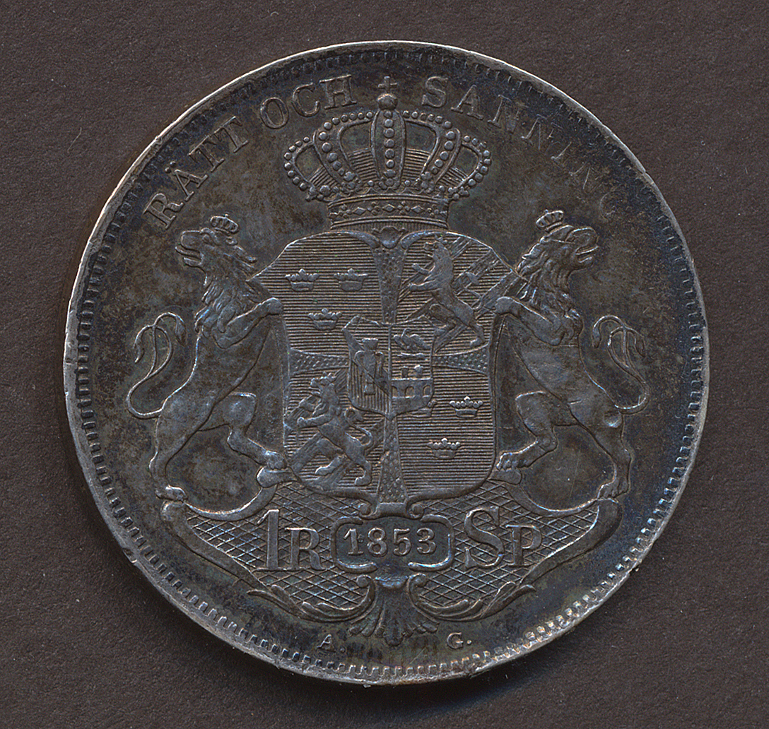 Oskar I. Riksdaler specie 1853, mindre smalare huvud, punkt efter GÖTH, årtalets1:a med lutande hake. SM 33. MIS I.10a. 1+ varit rengjord, mörk patina.