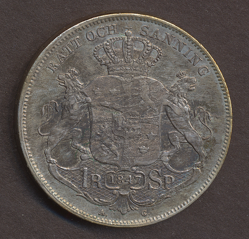 Oskar I. Riksdaler specie 1847, årtalets 1:a med horisontell hake. SM 28. MIS I.5a. Bra 1/1+ varit lätt rengjord, rispor.