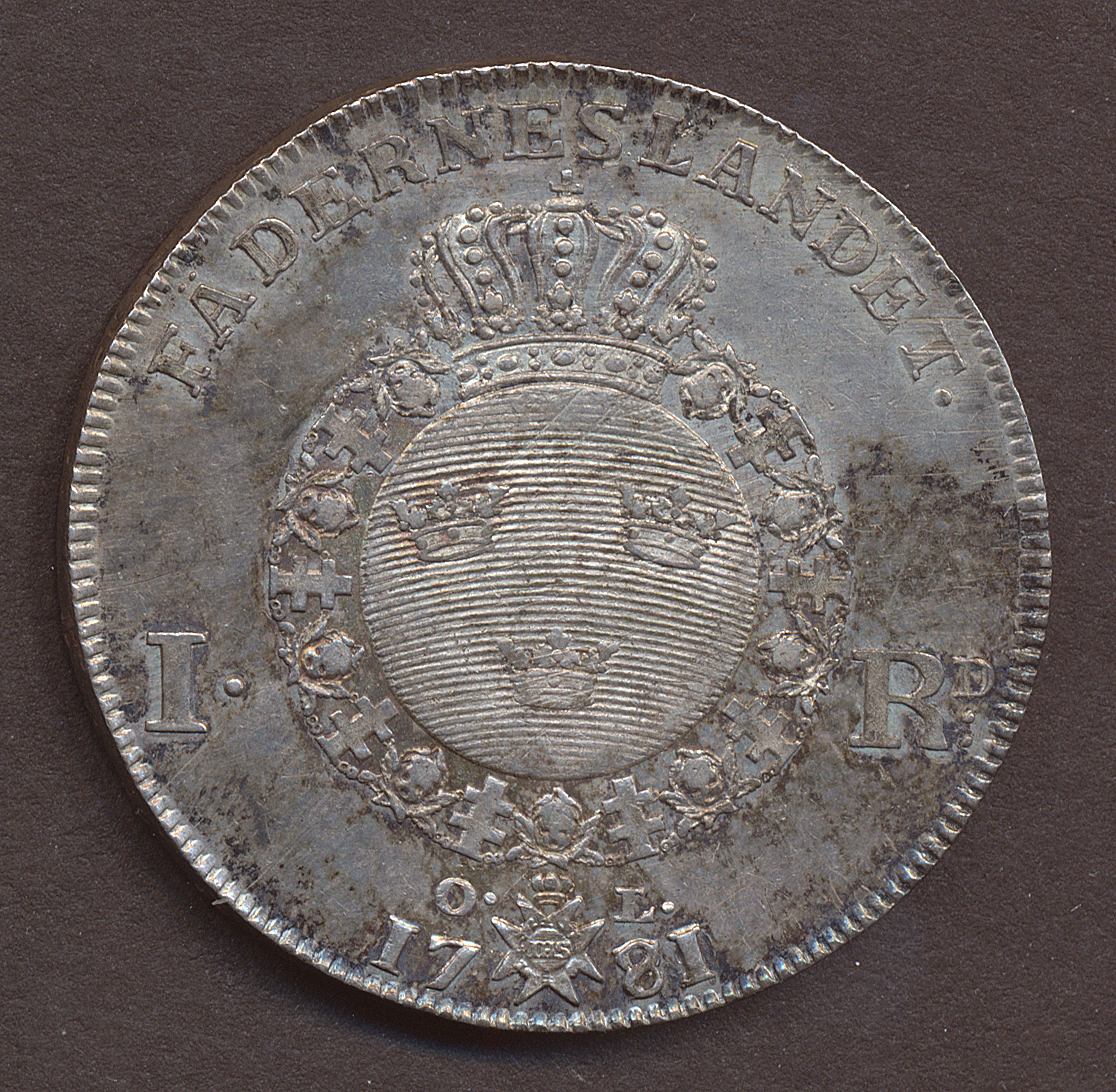 Gustav III. Riksdaler 1781/79, 1775 års bild. 29,36 g. SM 47a. SMB 18. 1/1+)(1+ varit rengjord, ojämn patina.