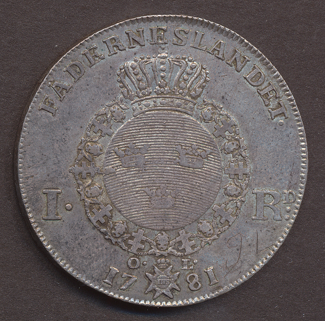 Gustav III. Riksdaler 1781, 1775 års bild. 29,11 g. SM 47a. SMB 21. 1/1+ repa, inristning.
