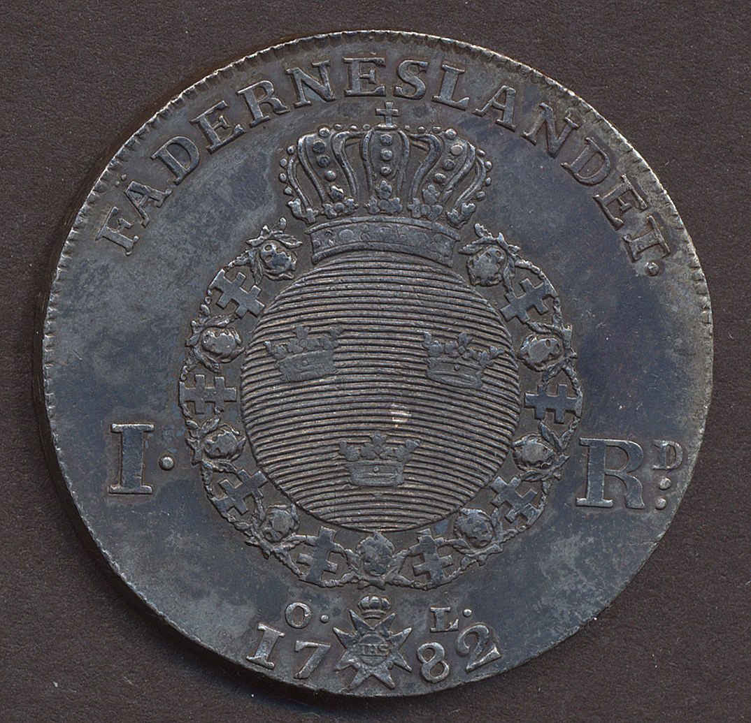 Gustav III. Riksdaler 1782. 29,47 g. SM 48. SMB 22. 1/1+ varit rengjord, ojämn patina.