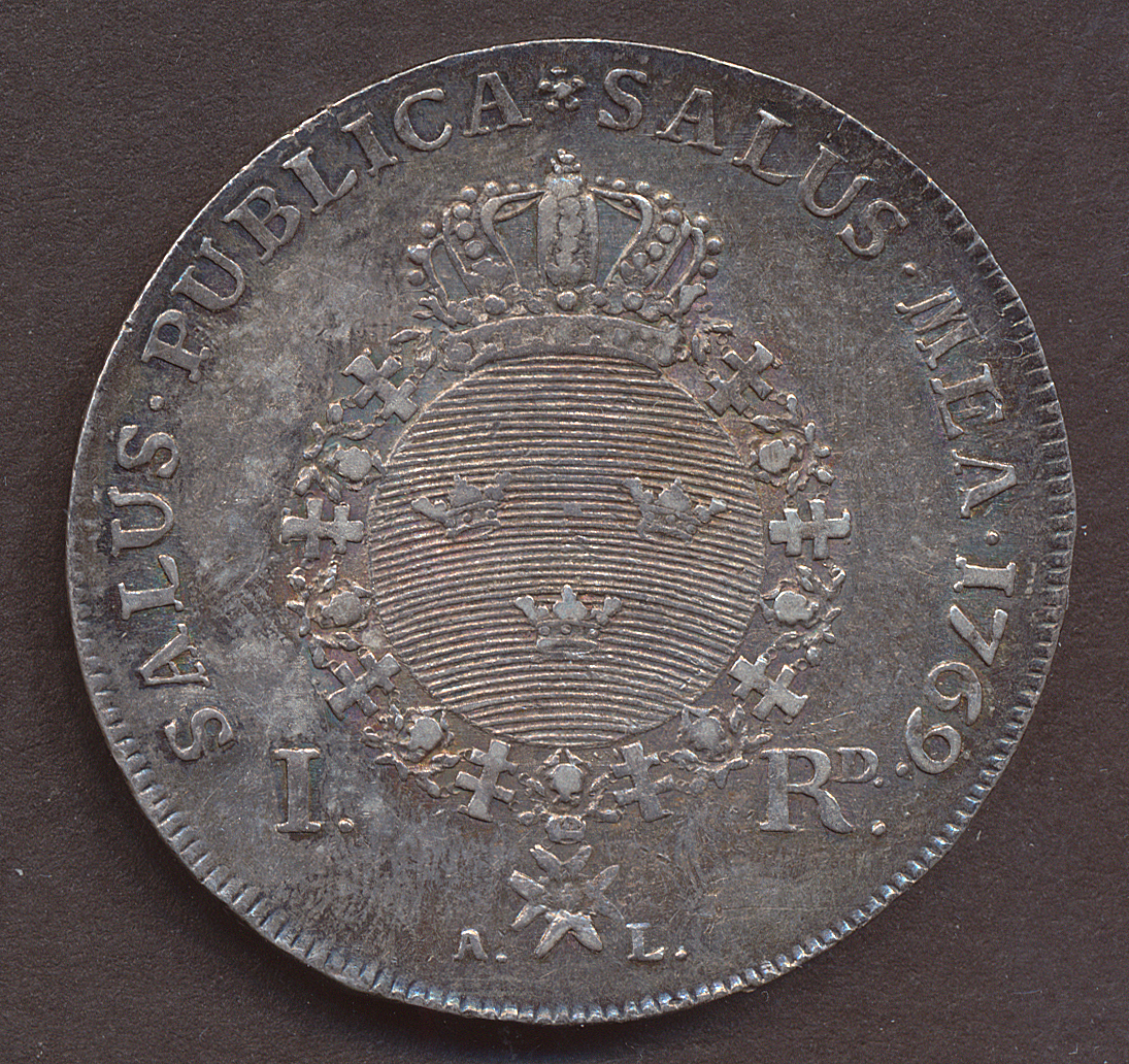 Adolf Fredrik. Riksdaler 1769, 7 serafer, liten bild. 29,13 g. SM 58b. SMB 26. 1/1+ varit lätt rengjord, något ojämn patina.