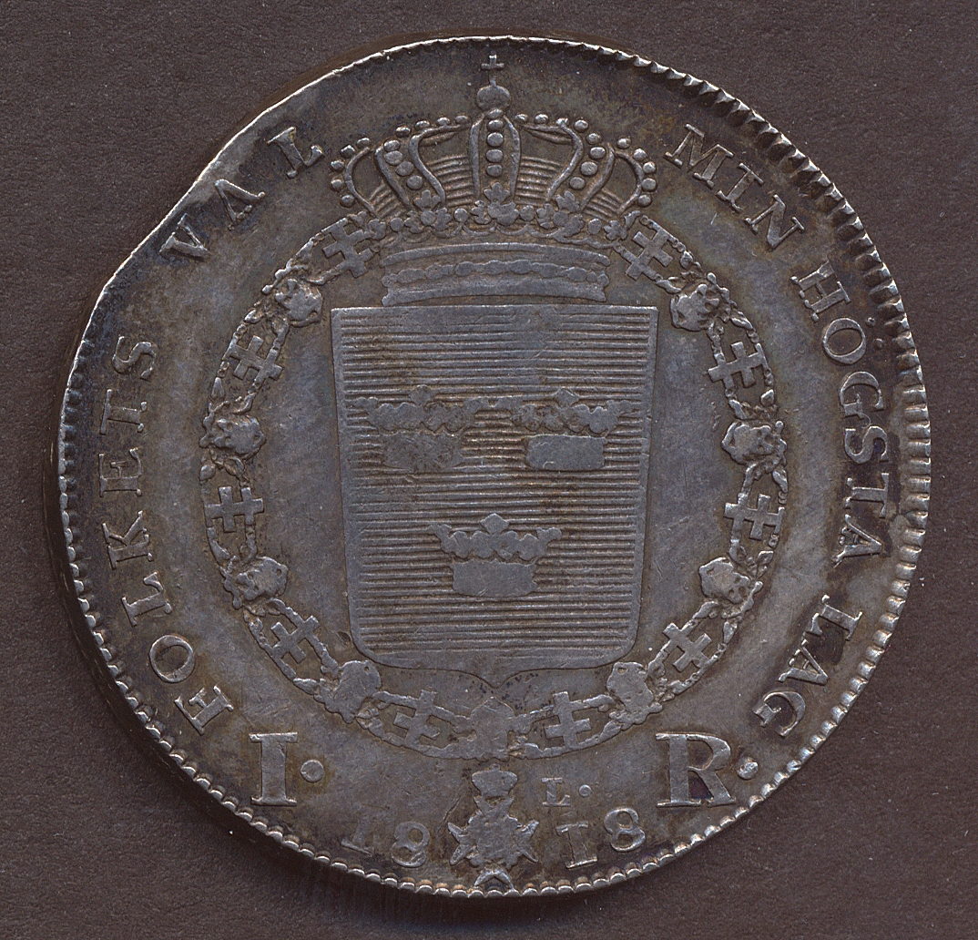 Karl XIII. Riksdaler 1818. 29,06 g. SM 16. SMB 7. 1/1+ kantex, varit rengjord, ojämn patina.