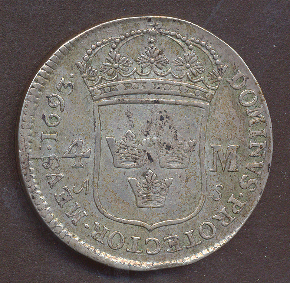 Karl XI. 4 mark 1693. 20,33 g. SM 87. SMB 58. 1/1+ kantex, ojämn patina.