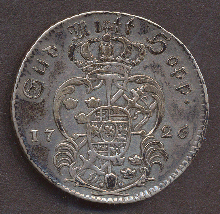 Fredrik I. 1/4 riksdaler 1726. 7,24 g. SM 104. SMB 79. 1)(1/1+ varit rengjord, rispor.
