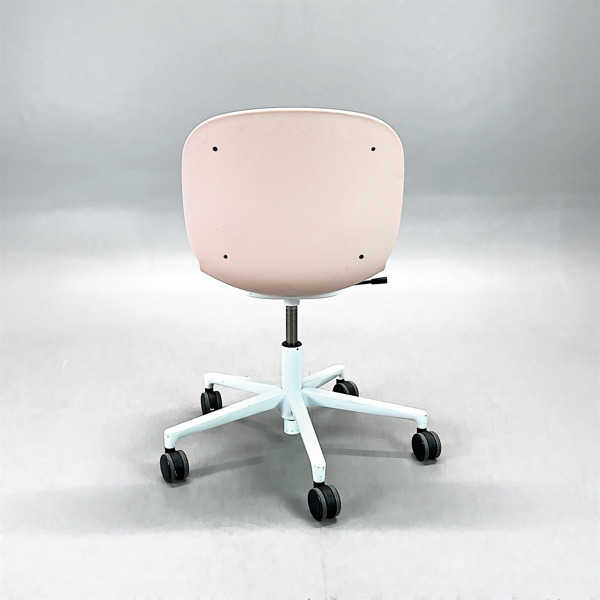 Skrivbordsstol från RBM, modell Noor. Rosa klädsel och vitt hjulstativ med hjul. Höj och sänkbar.