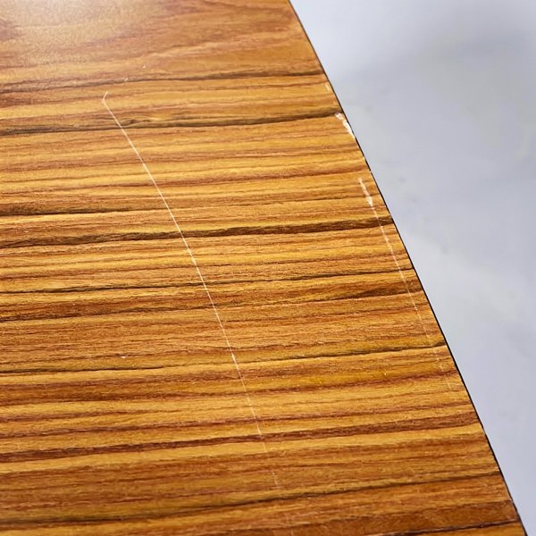Fanerad bordsskiva i valnöt. Repor. Kantstött.