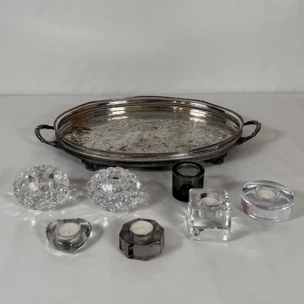 Bilder Ljuslyktor i glas, samt bricka, nysilver.
