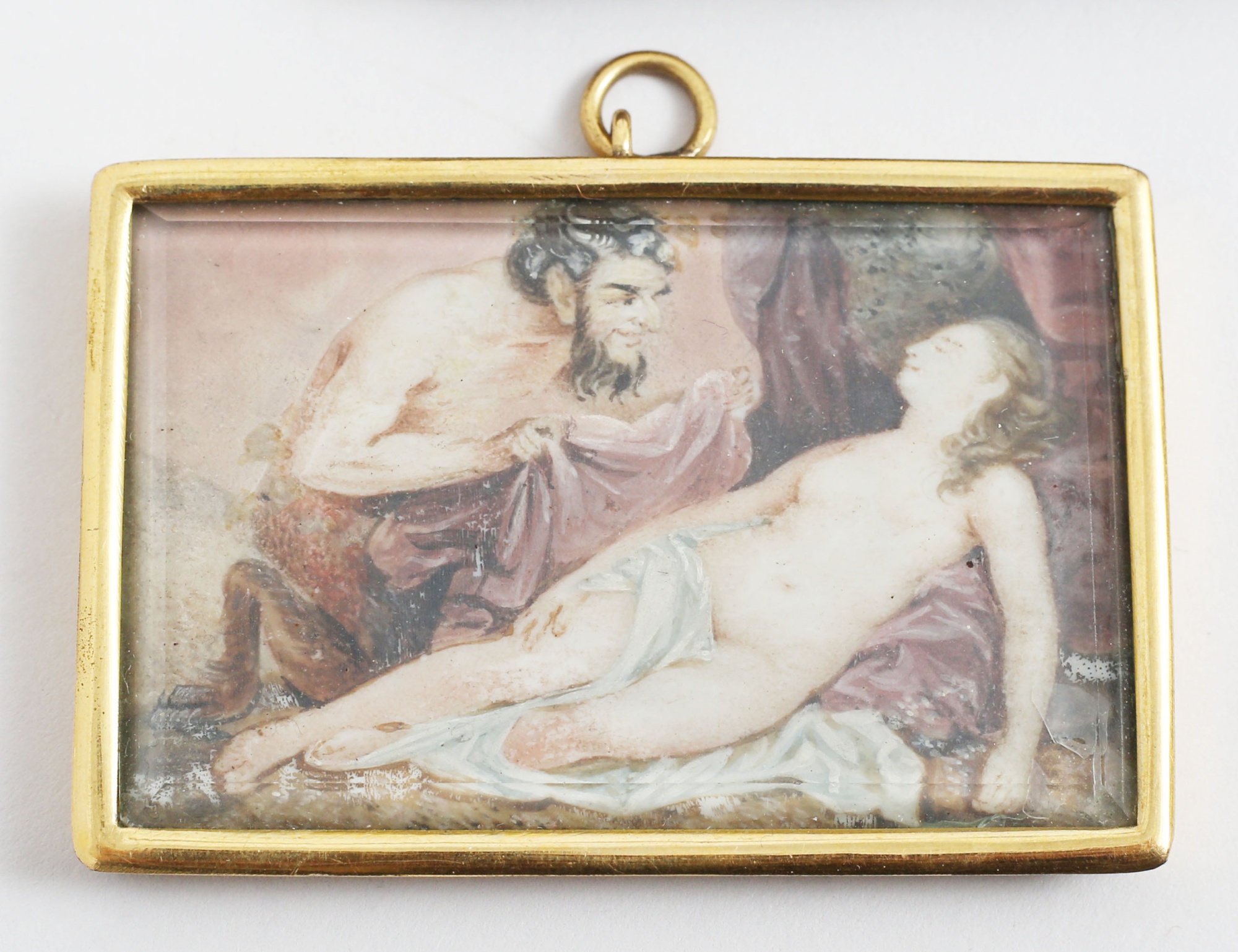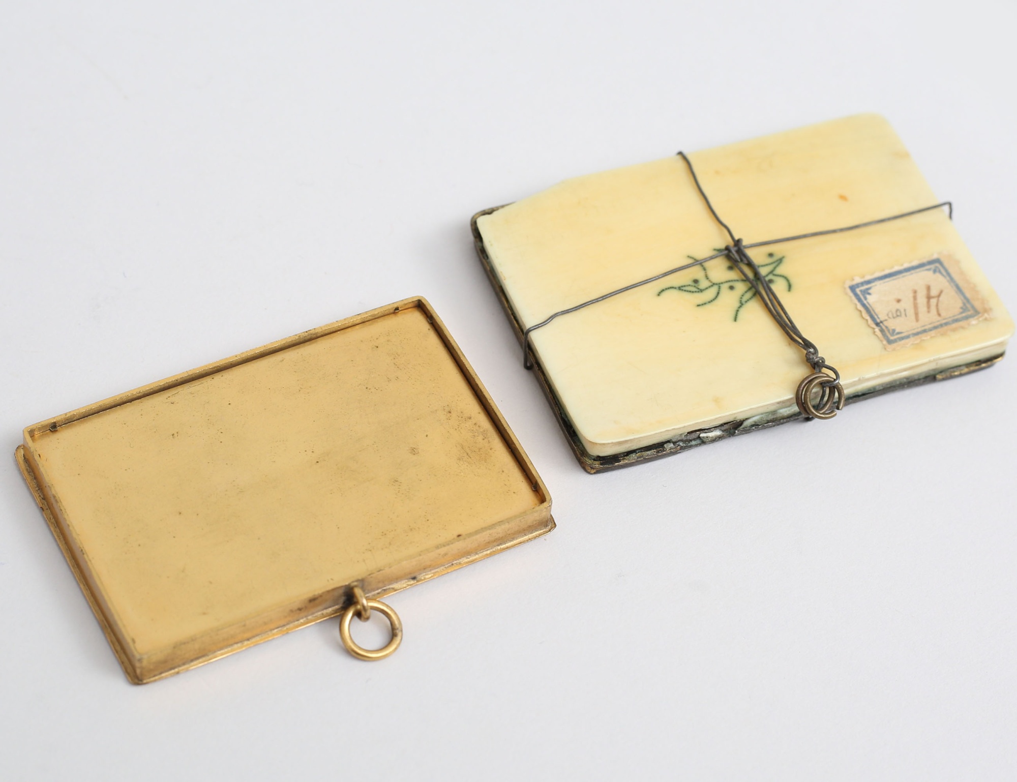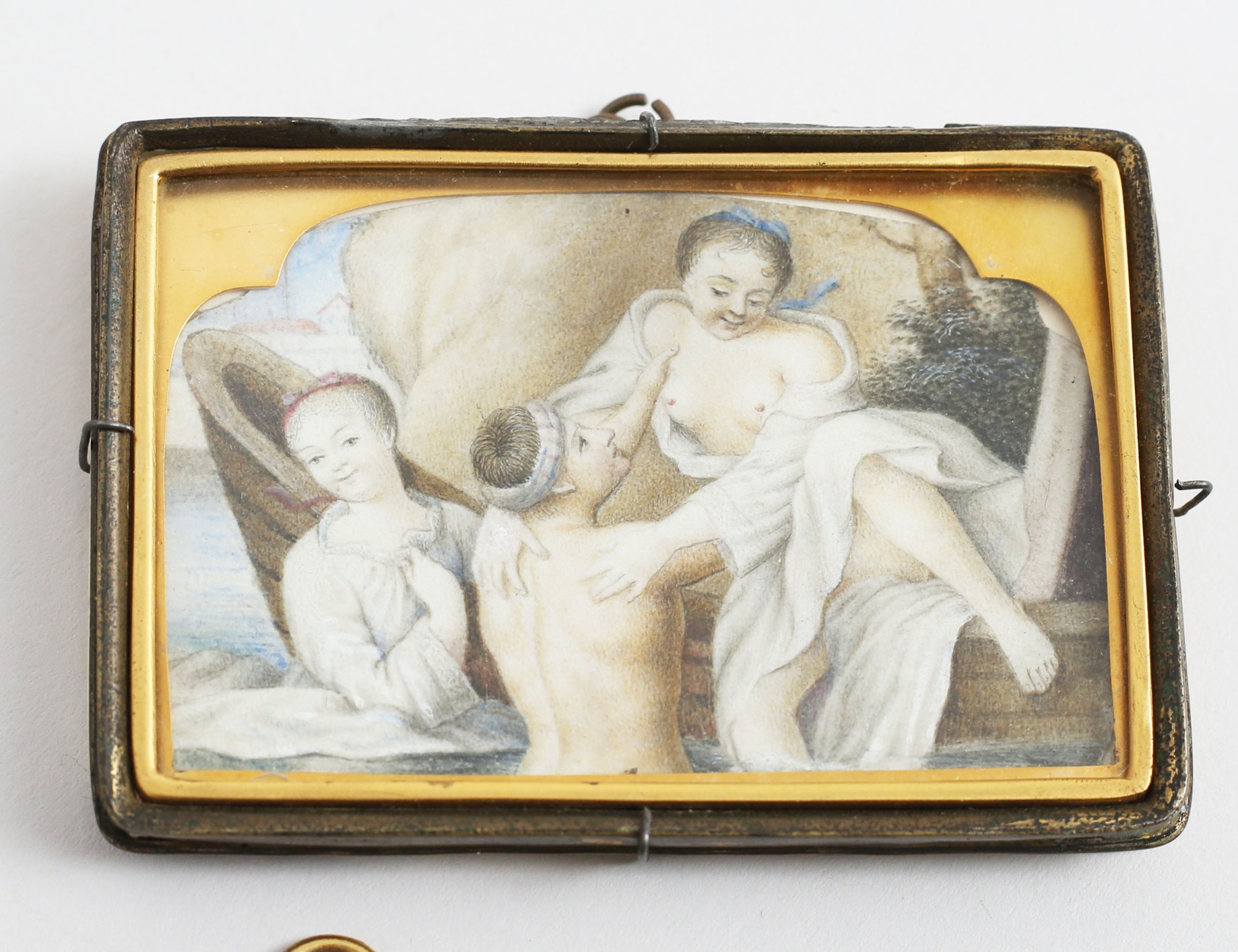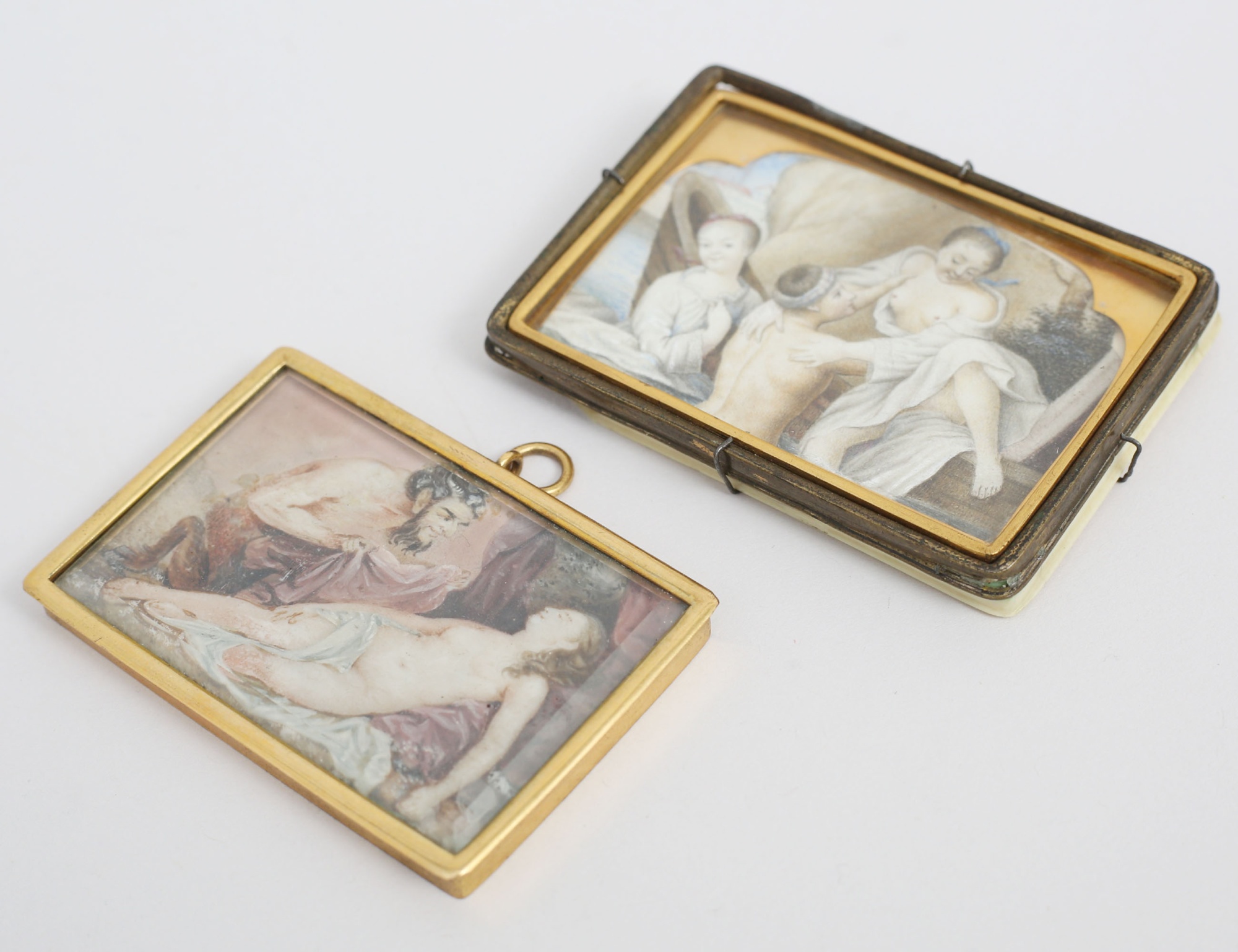 målning på ben, erotiskt motiv, ram i mässing med glas, 7x5 respektive 6,5x4,5 (ett bakstycke med skadat hörn)