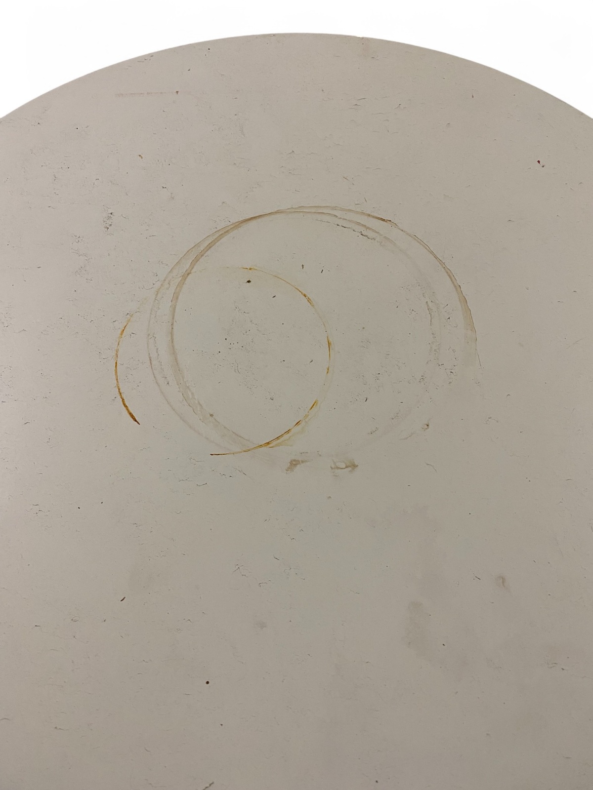 Bordsdiameter 59cm. Ringfläckar på bordsskivan, en del rostiga skruvhuvuden