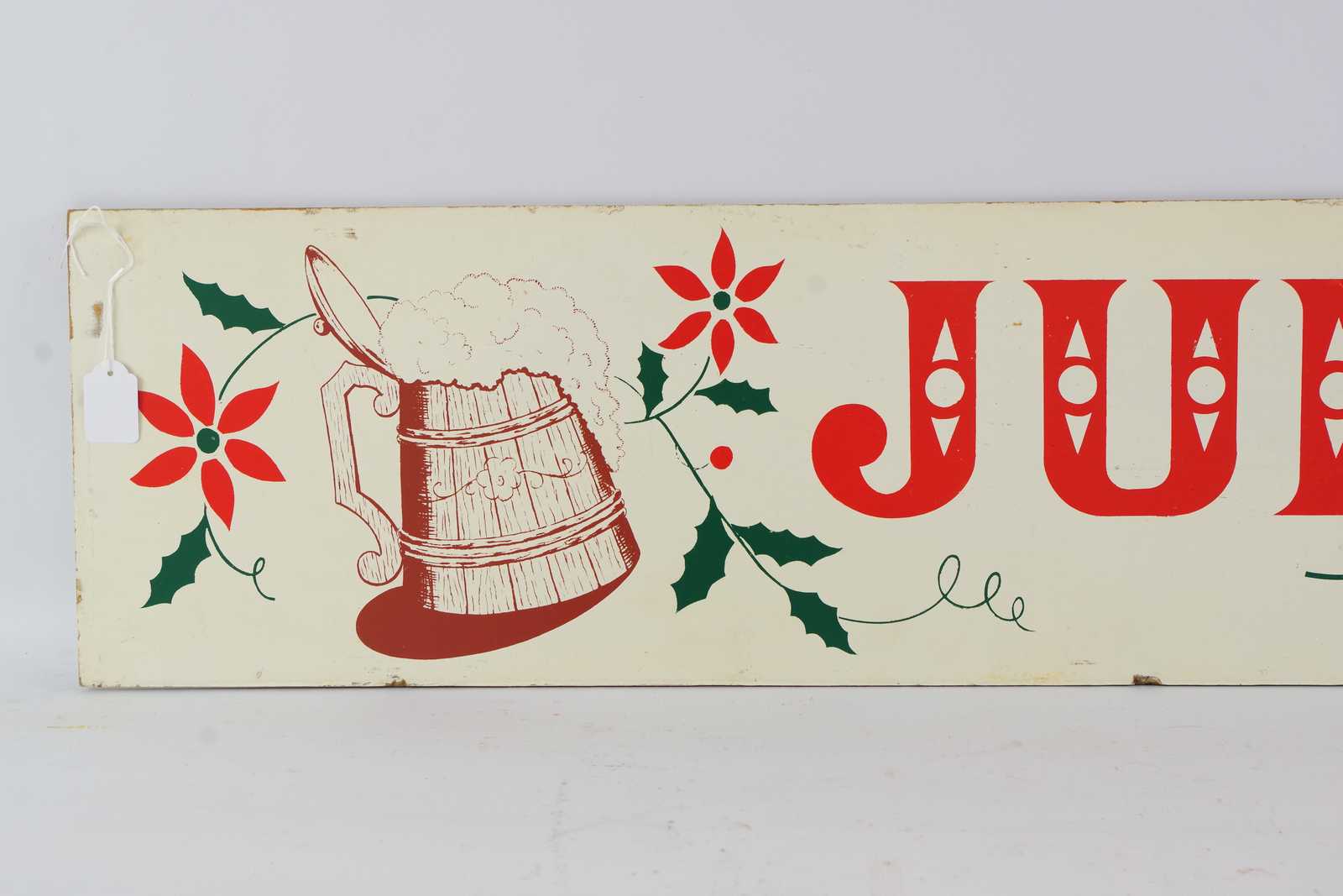 REKLAMSKYLT Julbrygd, tvåsidig, tryckt på masonit, 1900 talets mitt. 110x25cm (slitage, revor förekommer)