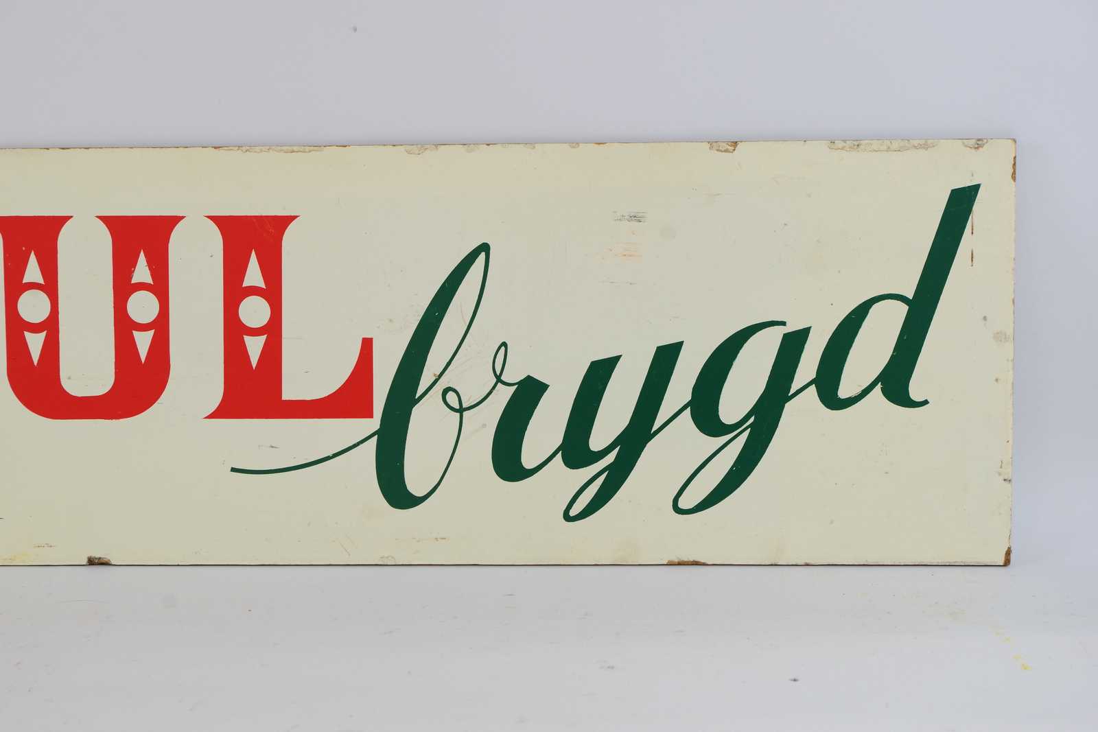 Bilder REKLAMSKYLT Julbrygd, tvåsidig, tryckt på masonit, 1900 talets mitt. 110x25cm (slitage, revor förekommer)