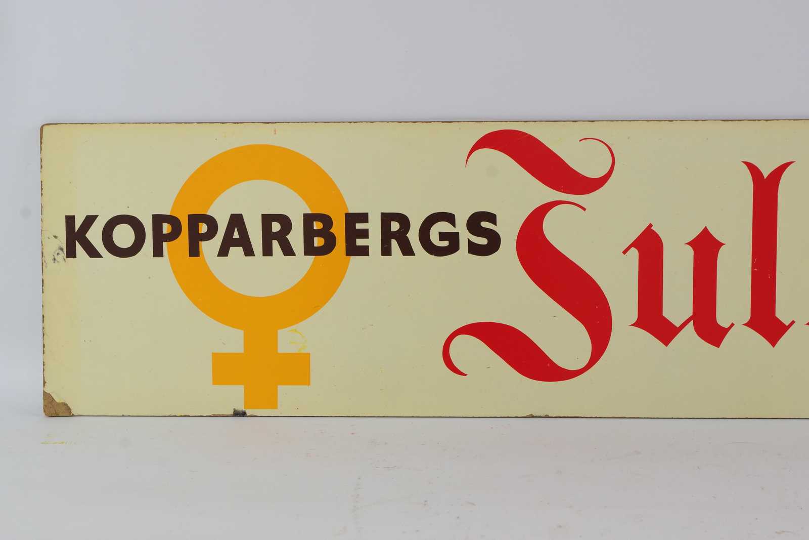 REKLAMSKYLT Kopparbergs Julöl, tvåsidig, tryckt på masonit, 1900 talets mitt. 110x25cmcm (slitage, färgbortfall förekommer)