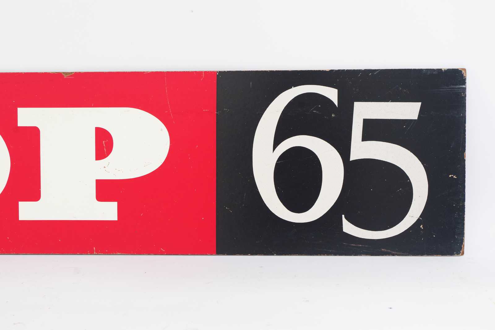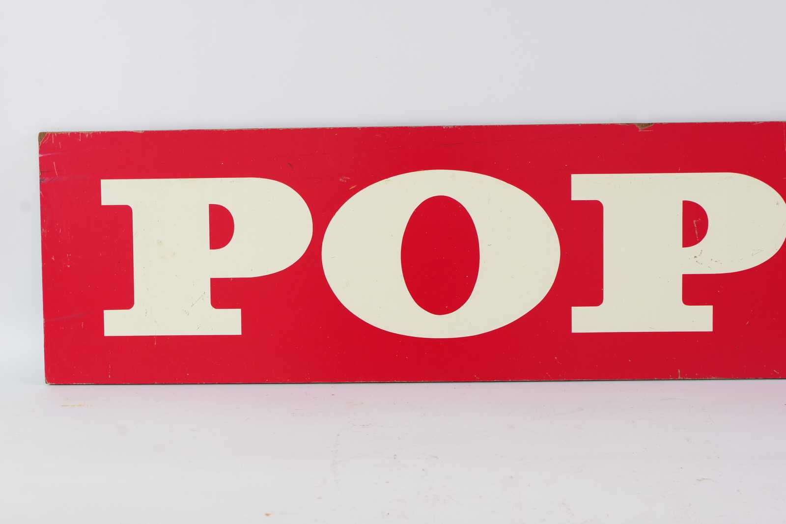REKLAMSKYLT Pop 65, tvÄsidig, tryckt pÄ masonit, 1900 talets mitt. 110x25cm (slitage, revor förekommer)