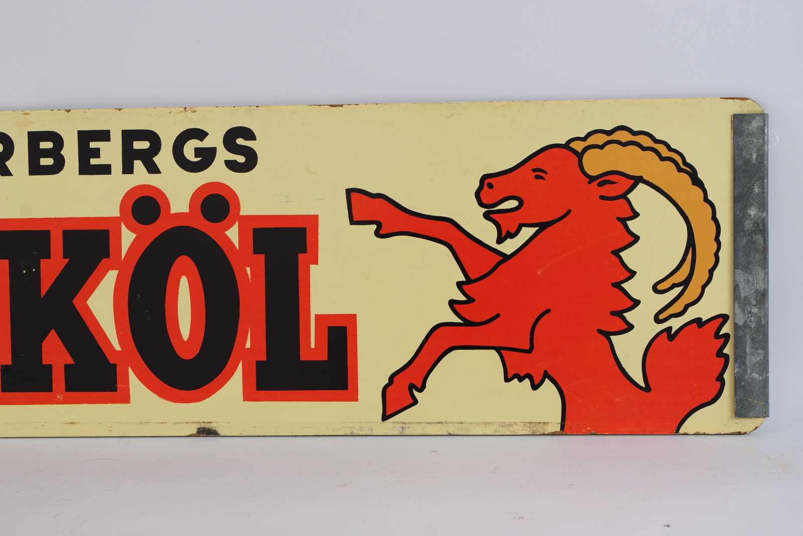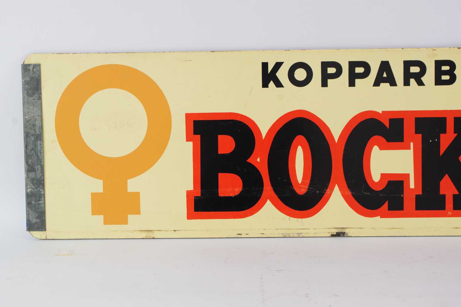 REKLAMSKYLT Kopparbergs Bocköl, tvåsidig, tryckt på masonit, 1900 talets mitt. 110x25cm (slitage, färgbortfall förekommer)
