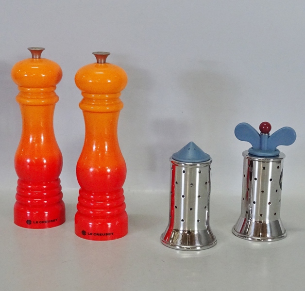 Auktioner Husgeråd & Vitvaror 2 par salt & peppar kvarnar/ströare, Le Creuset och Alessi, 19/2000-tal