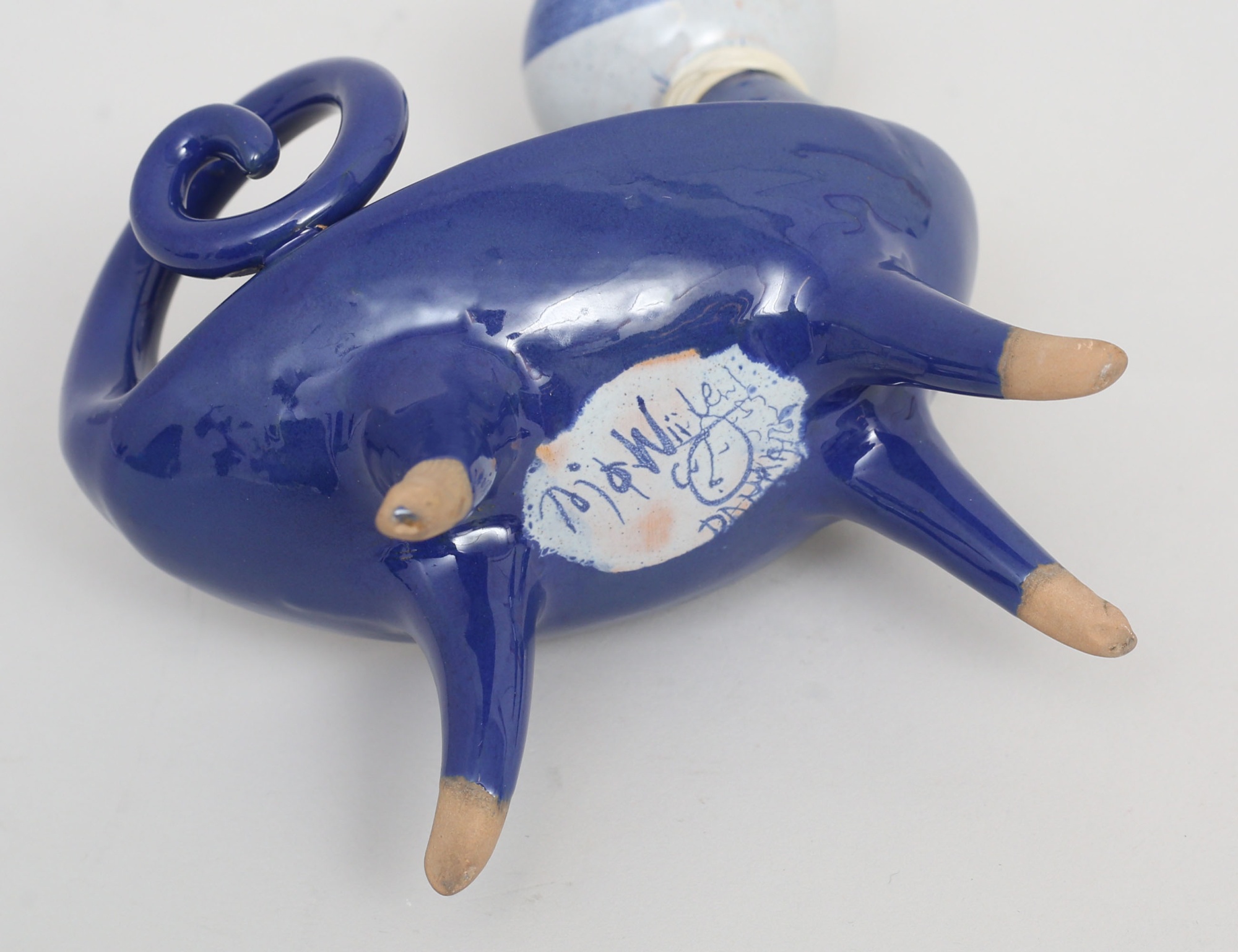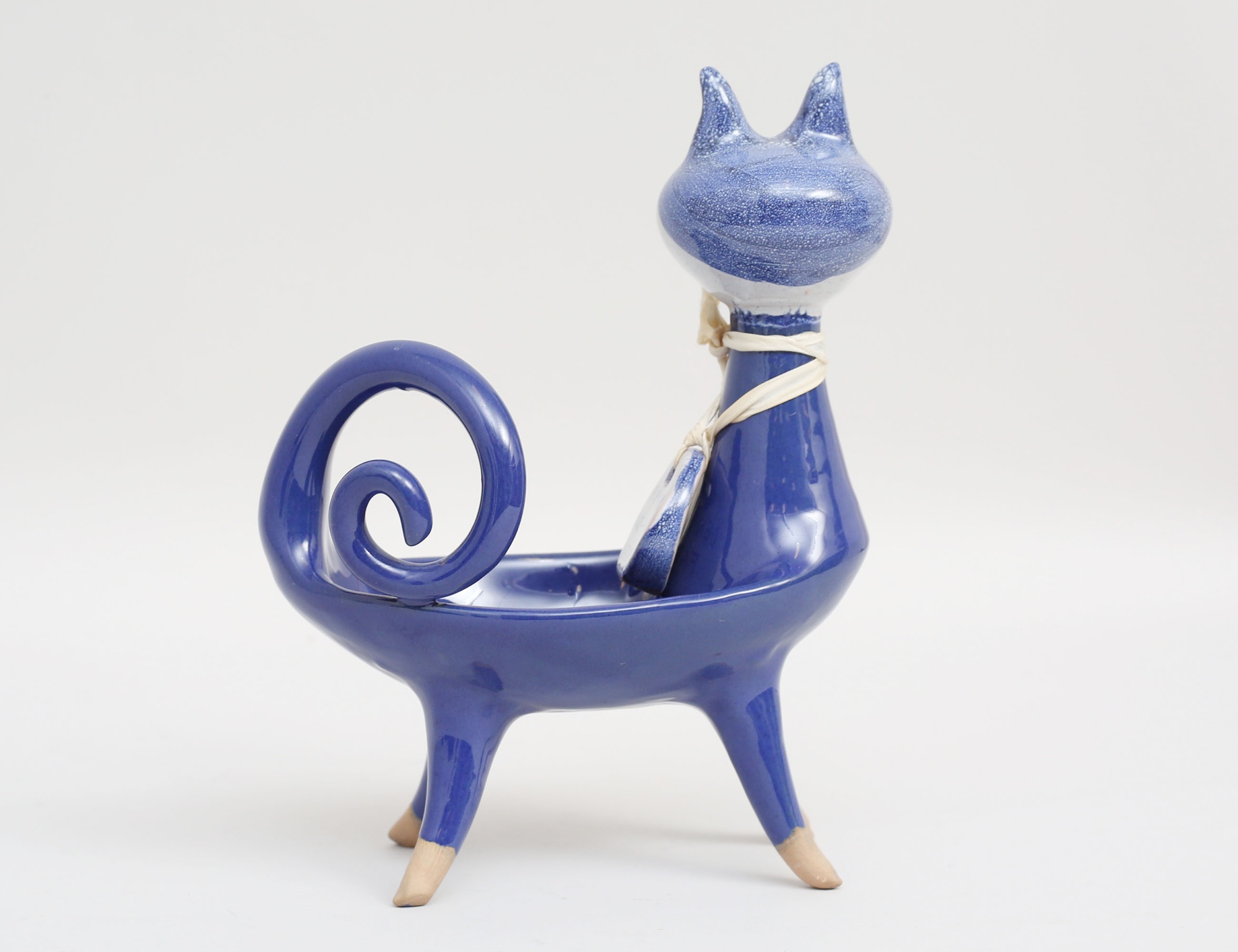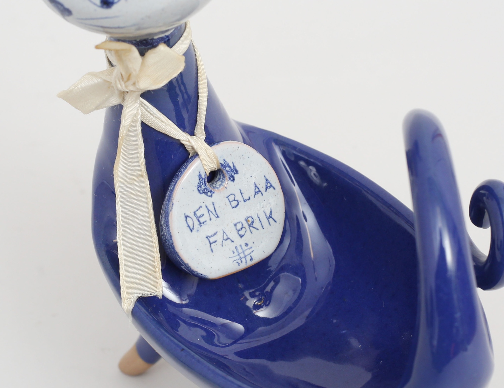 figurin katt, "Den blaa fabrik - vi spinder ikke vi vaever", signerad, höjd 17, bredd 13