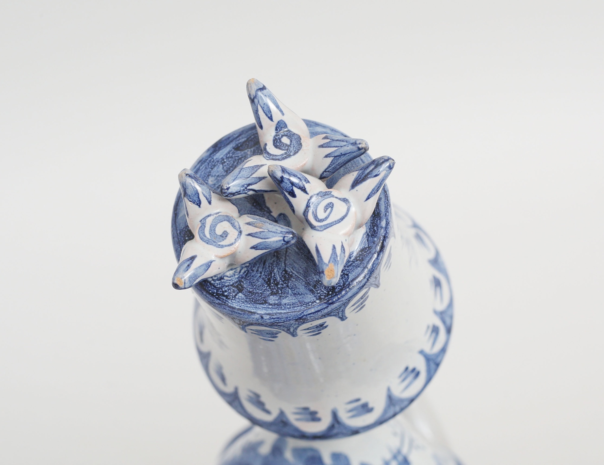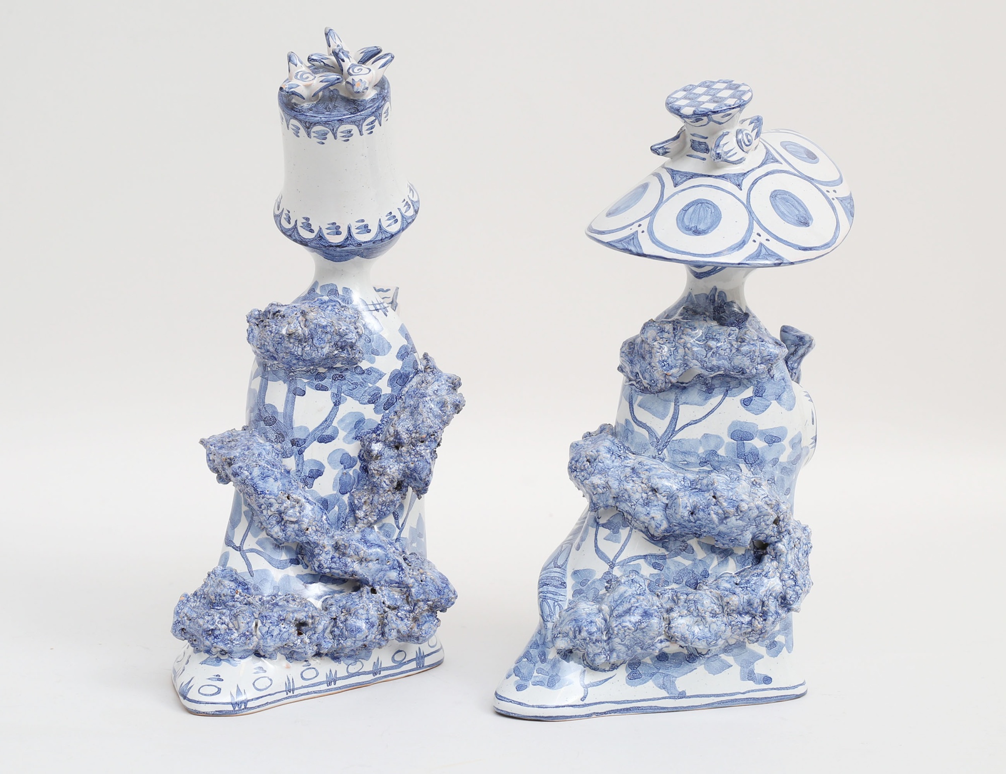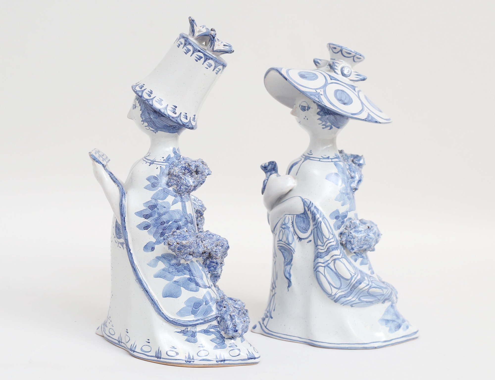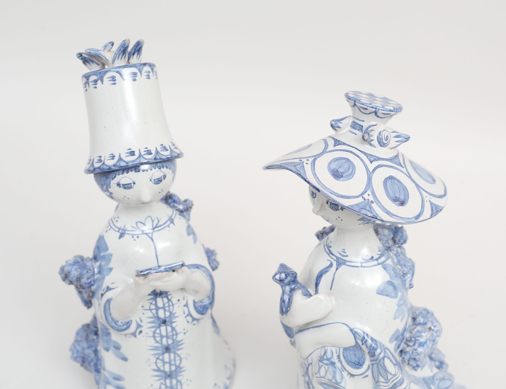2 stycken figuriner, kvinnofigurer med katt respektive bok, blåvit underglasyrdekor, monogramsignerade, M13 respektive M15, höjd 24/25 (microglasyrmistor)
