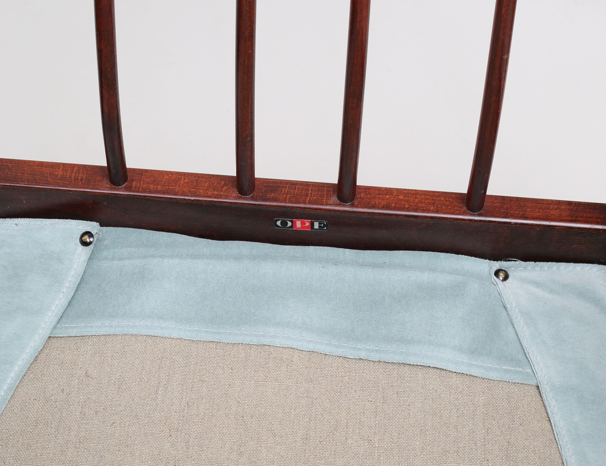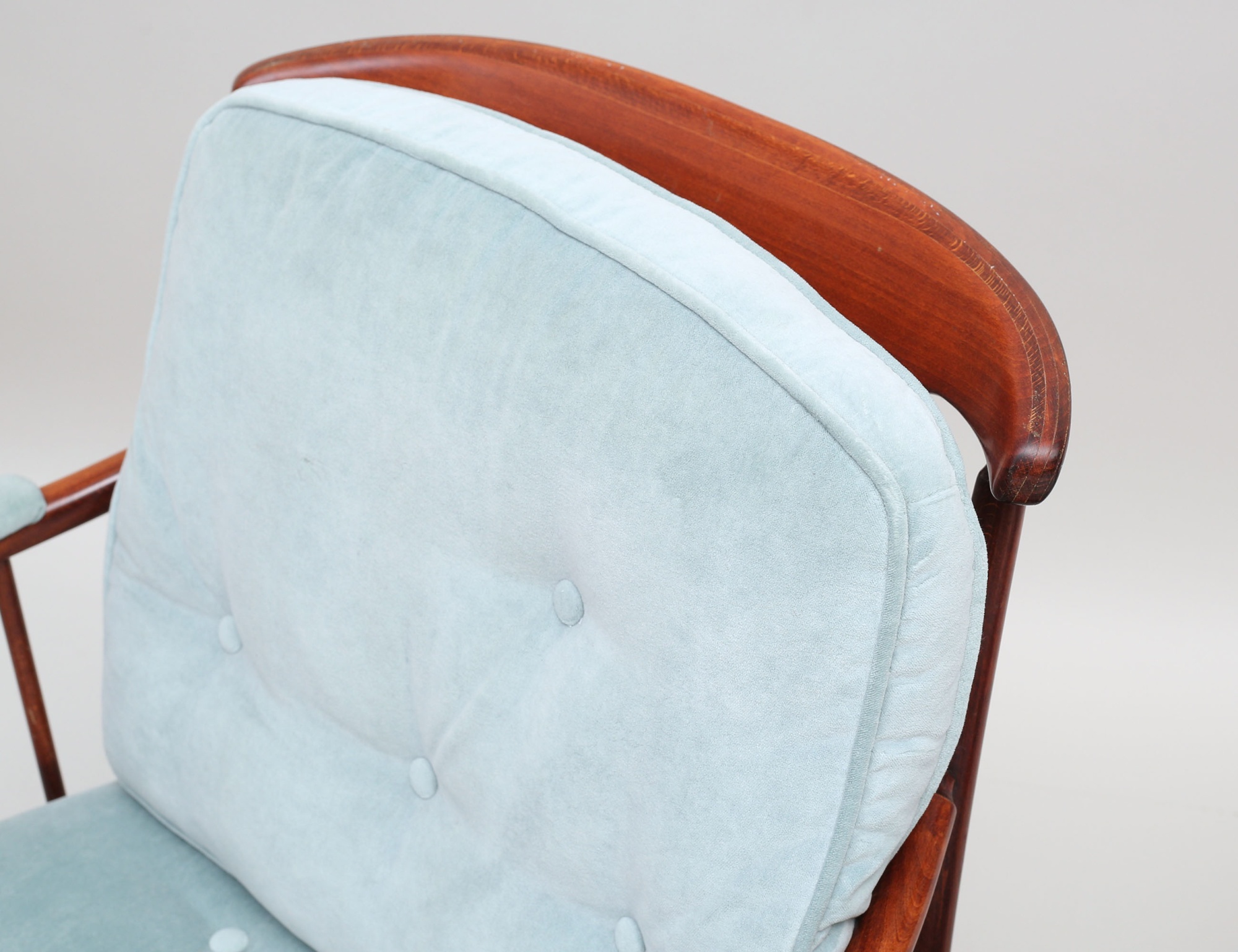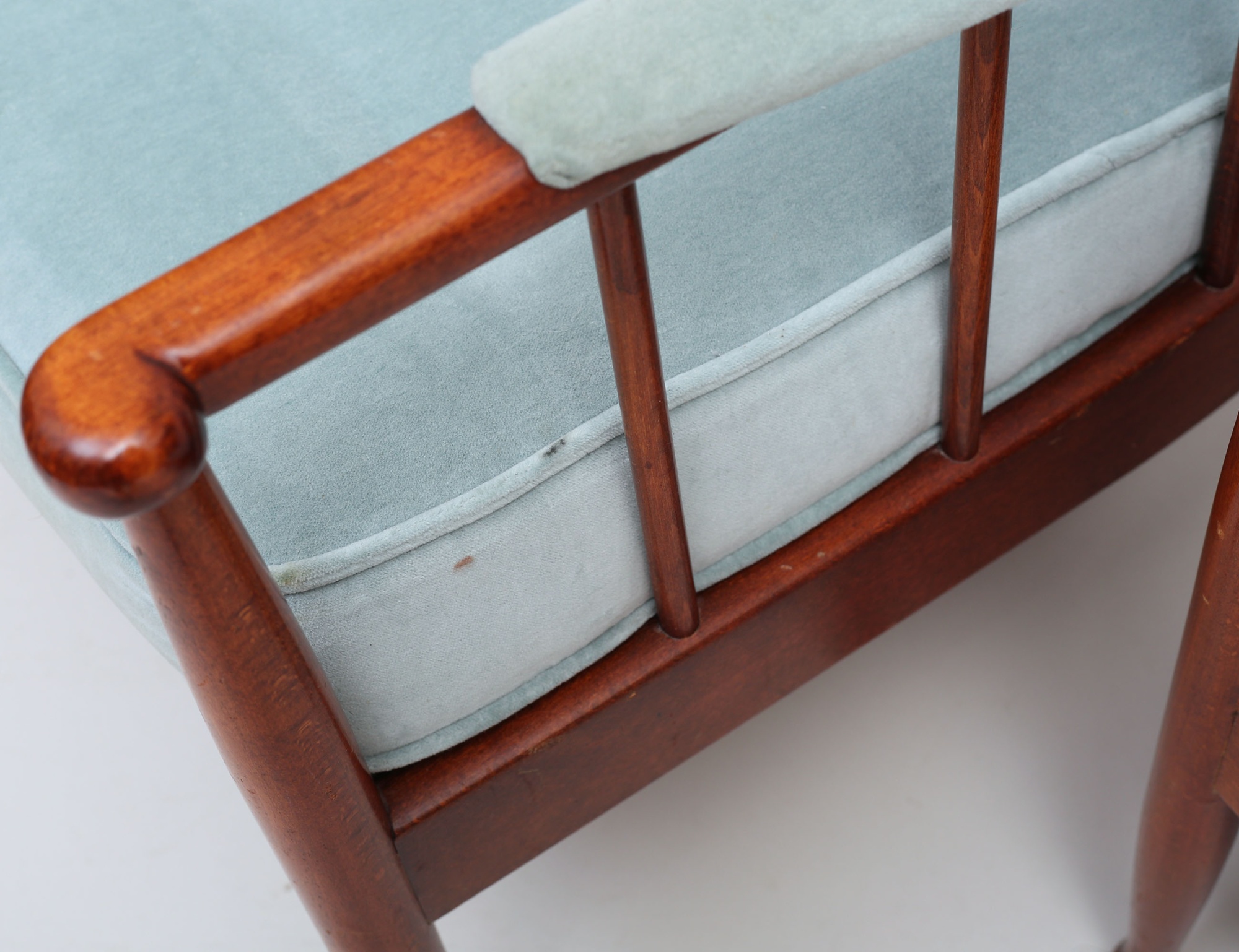 OPE Möbler 1960-tal, mahogny, klädsel i ljusblå plyschklädsel, höjd 80, bredd 73 (smärre fläckar, en knapp i rygg saknas)
