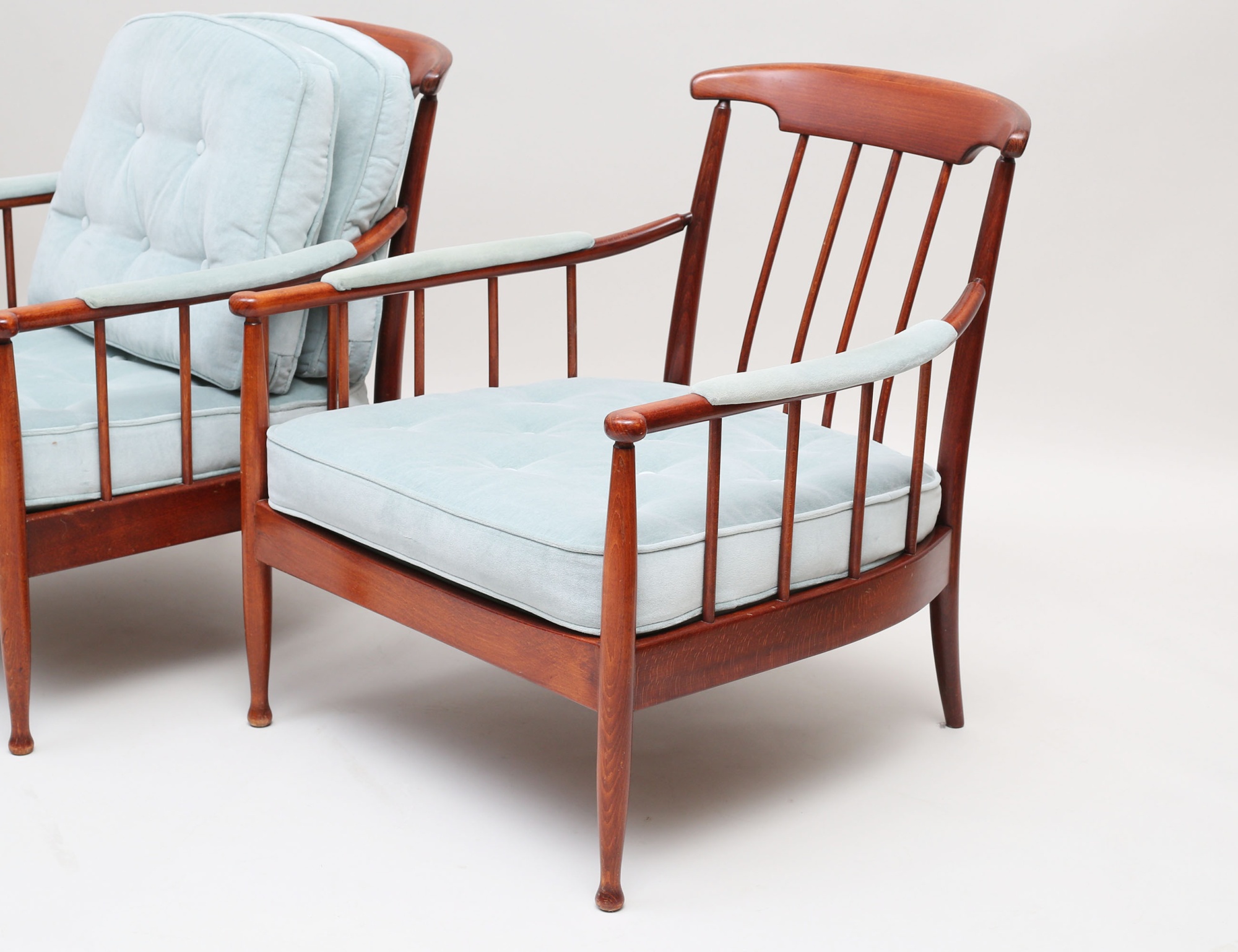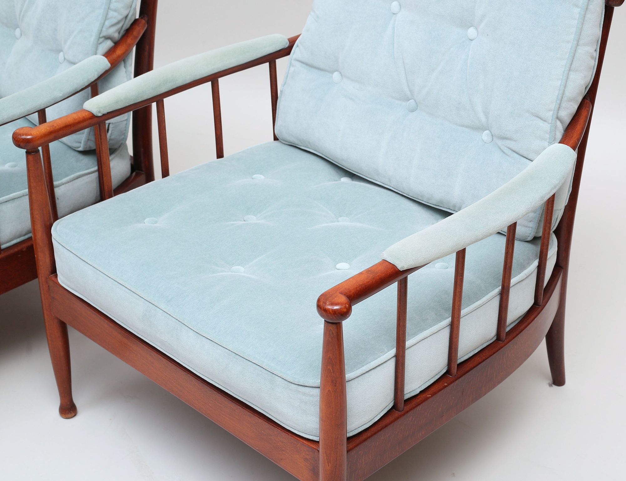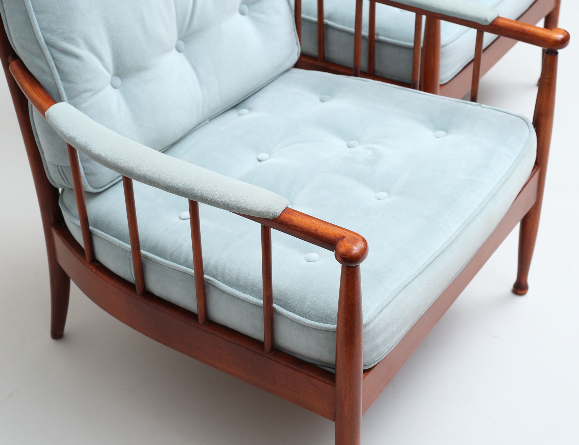 OPE Möbler 1960-tal, mahogny, klädsel i ljusblå plyschklädsel, höjd 80, bredd 73 (smärre fläckar, en knapp i rygg saknas)