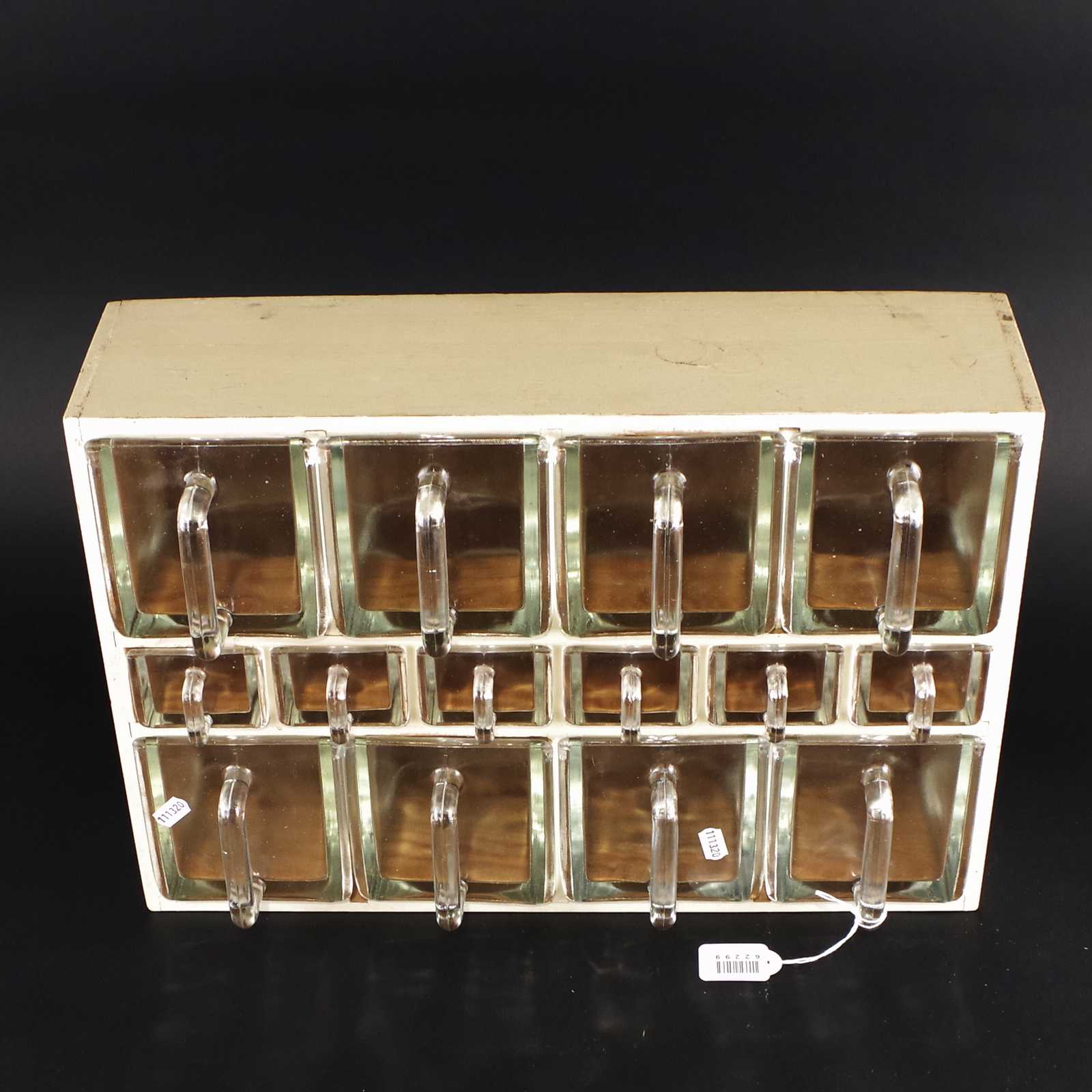Bilder KRYDDHYLLA med glaslådor, trä, äldre. 46x31x12cm.