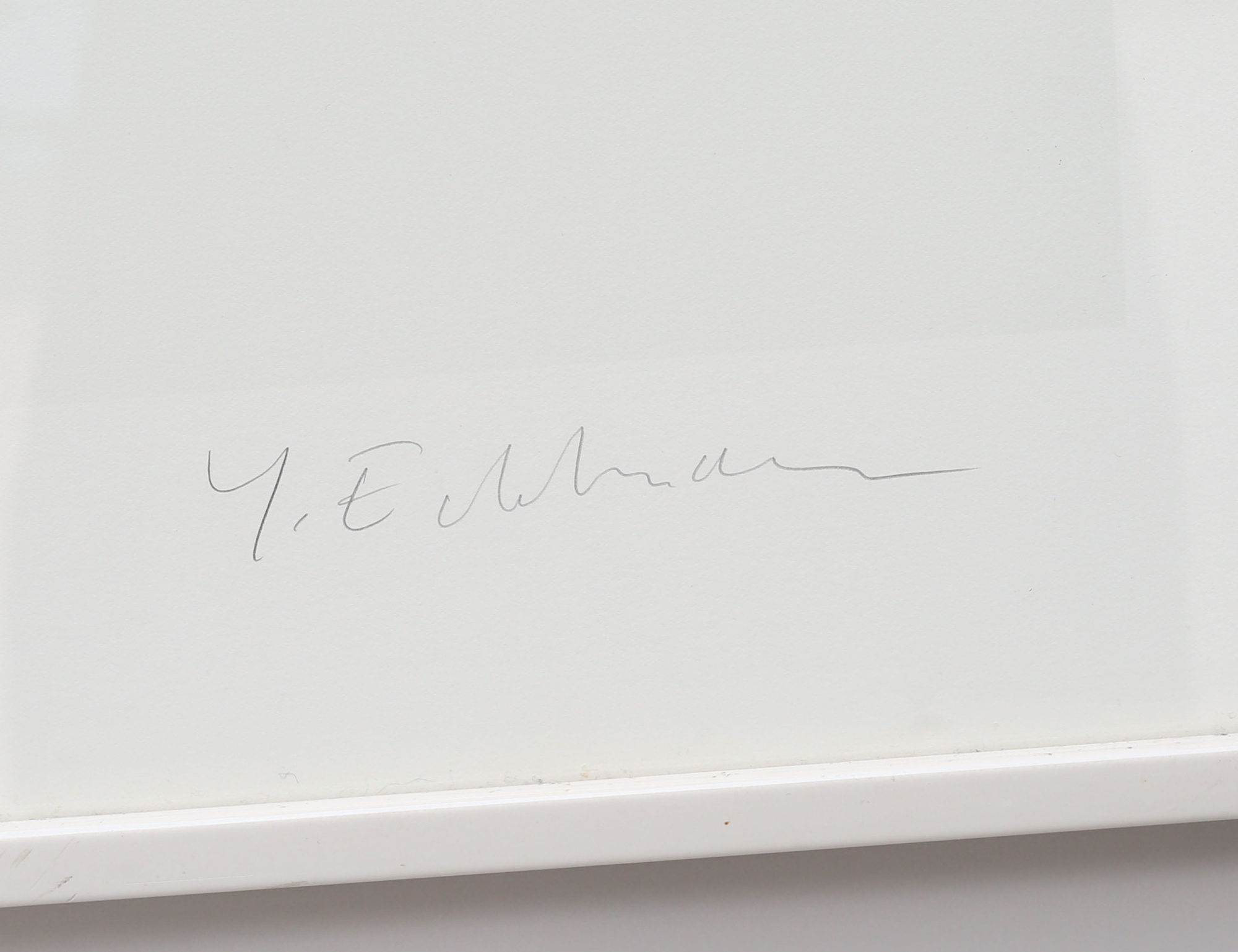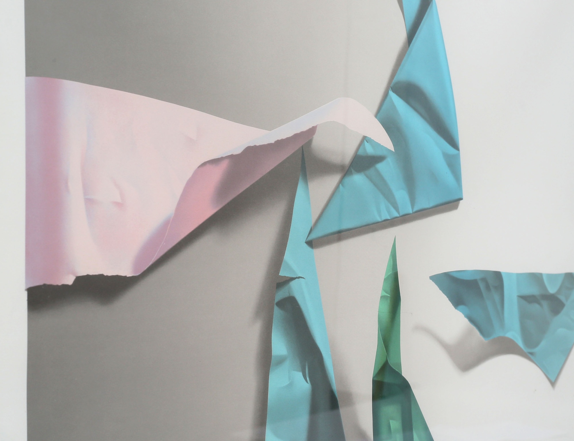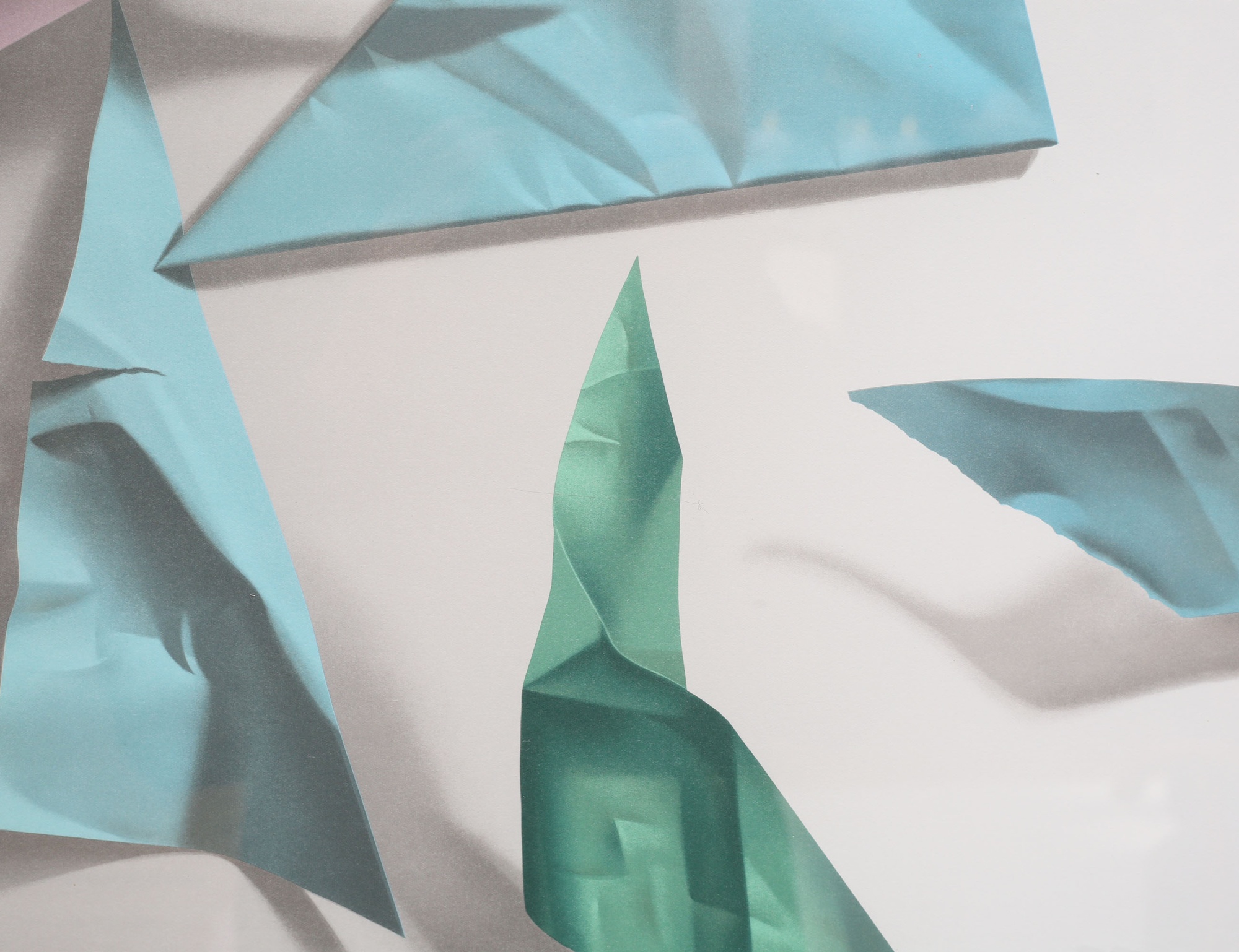 färglitografi 125/150, komposition med papper i rosa och grönt, signerad, bildmått 52x80, rammått 66x93