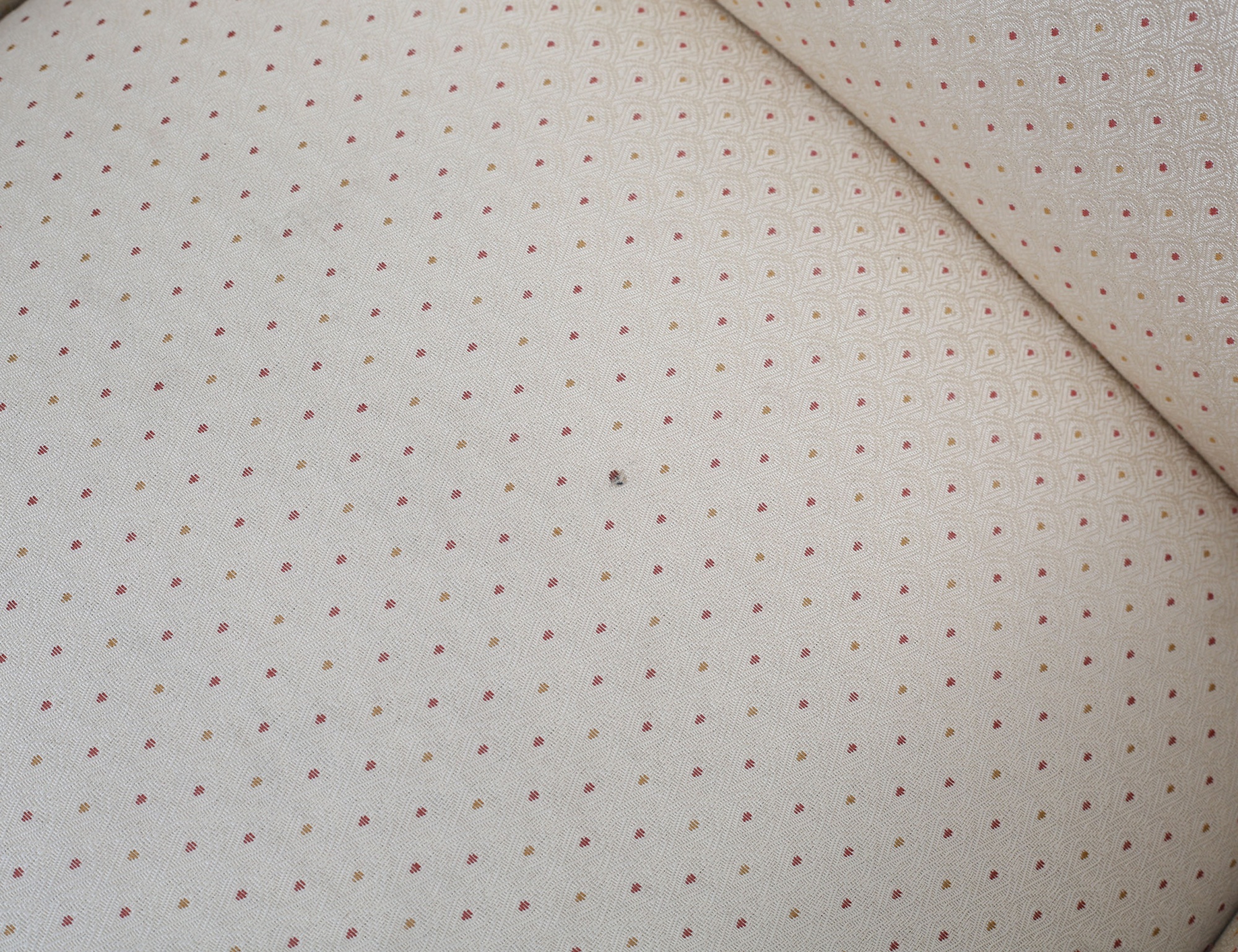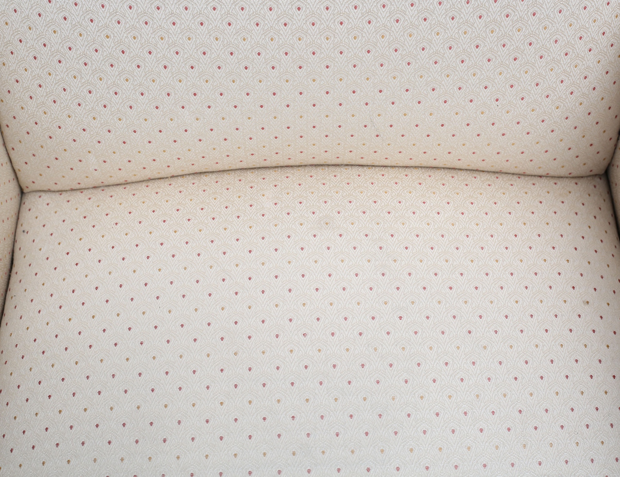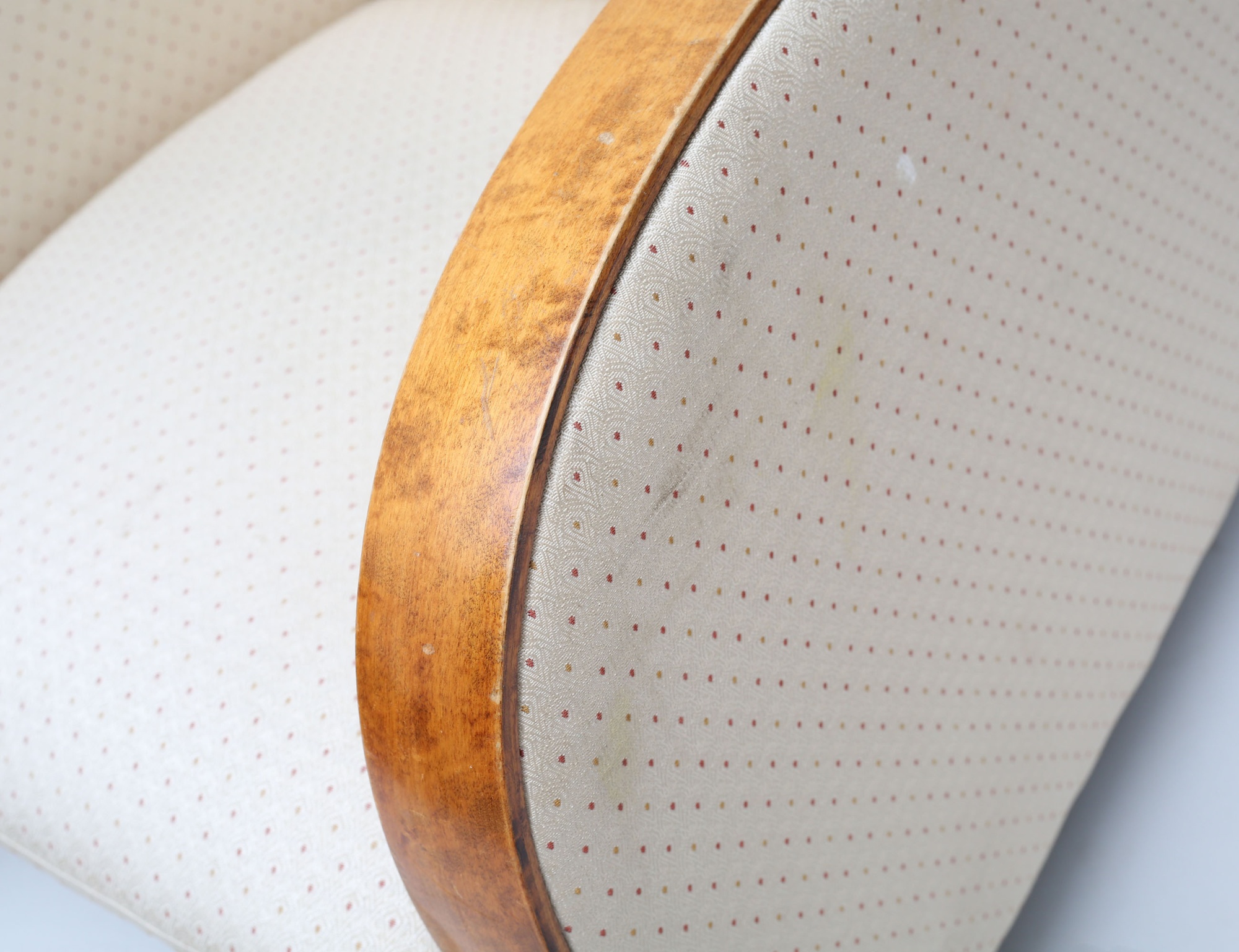armlän i betsad bok, helstoppade med ljus tygklädsel, höjd 74, bredd 62, djup 85 (smärre fläckar)
