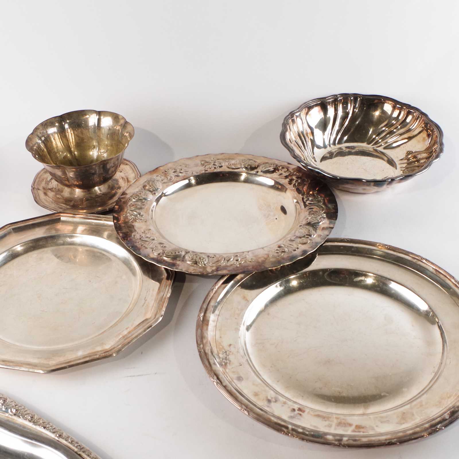 Bilder Parti BRICKOR & SKÅLAR bl.a. nysilver. B:43cm största.
