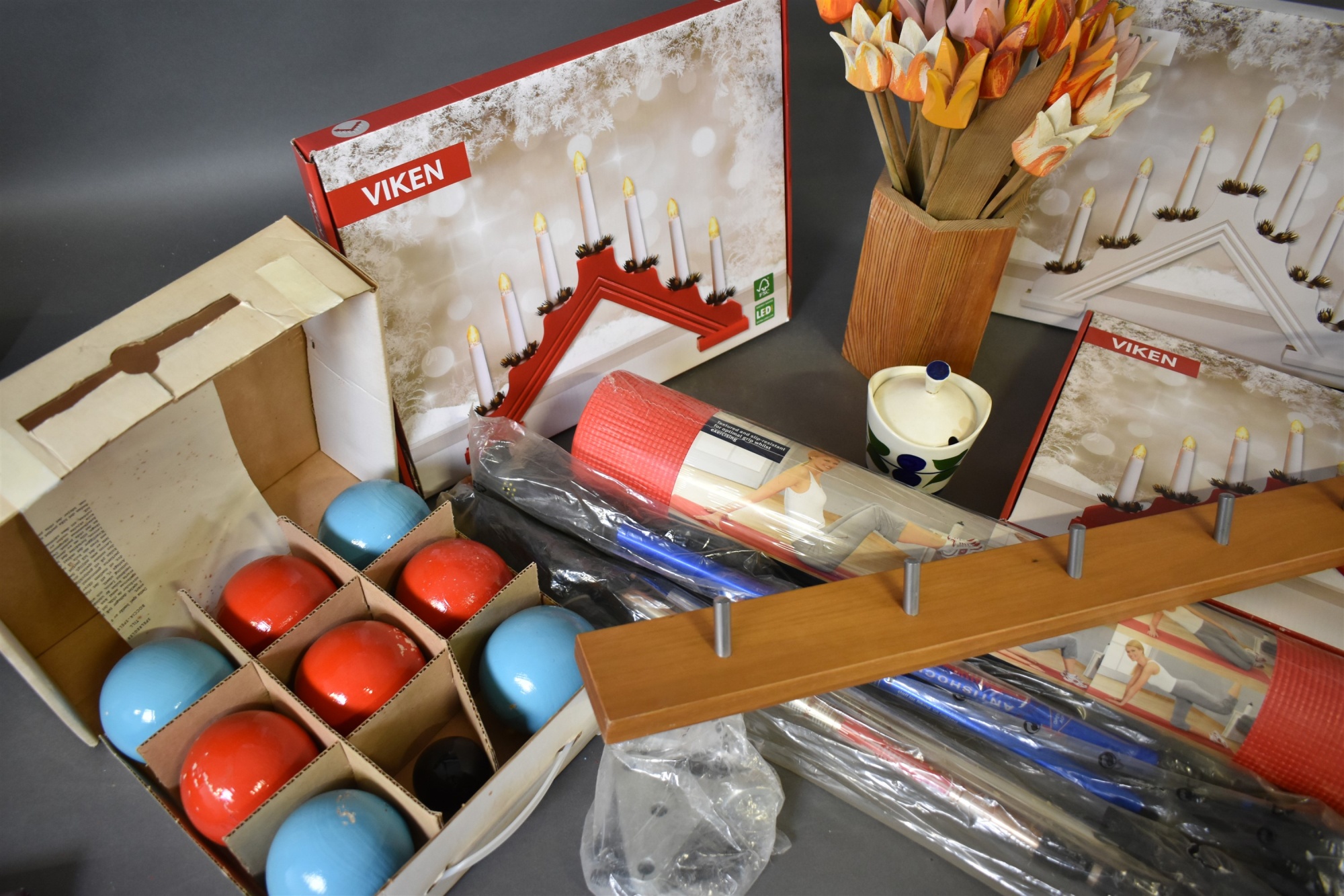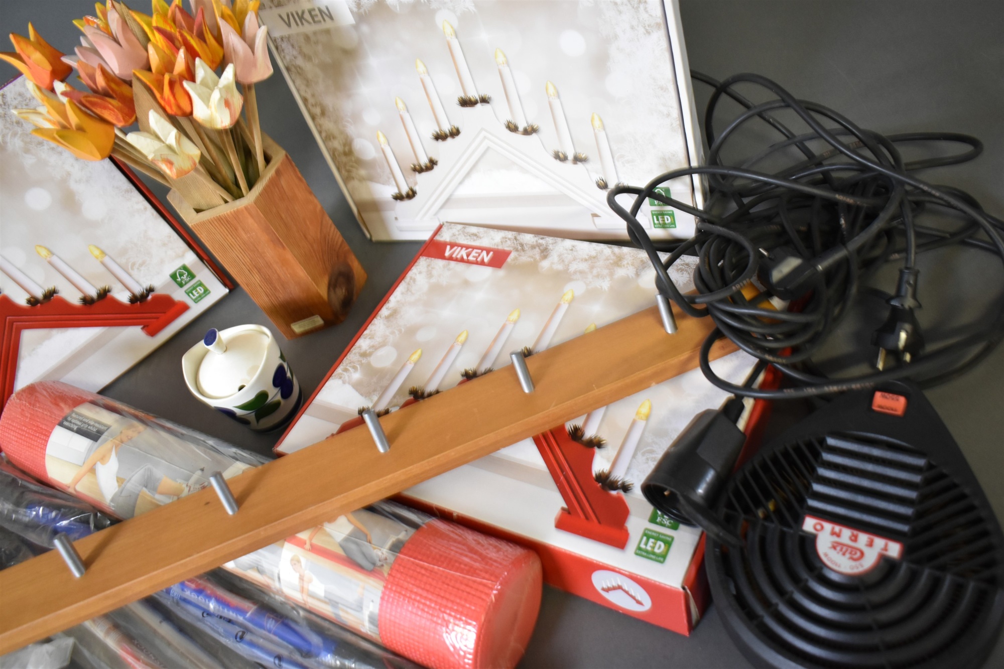 Auktioner Bygg & Trädgård Parti fritidsföremål, el-ljusstakar, knopp limmad på Rörstrandsburk, längsta 80 cm
