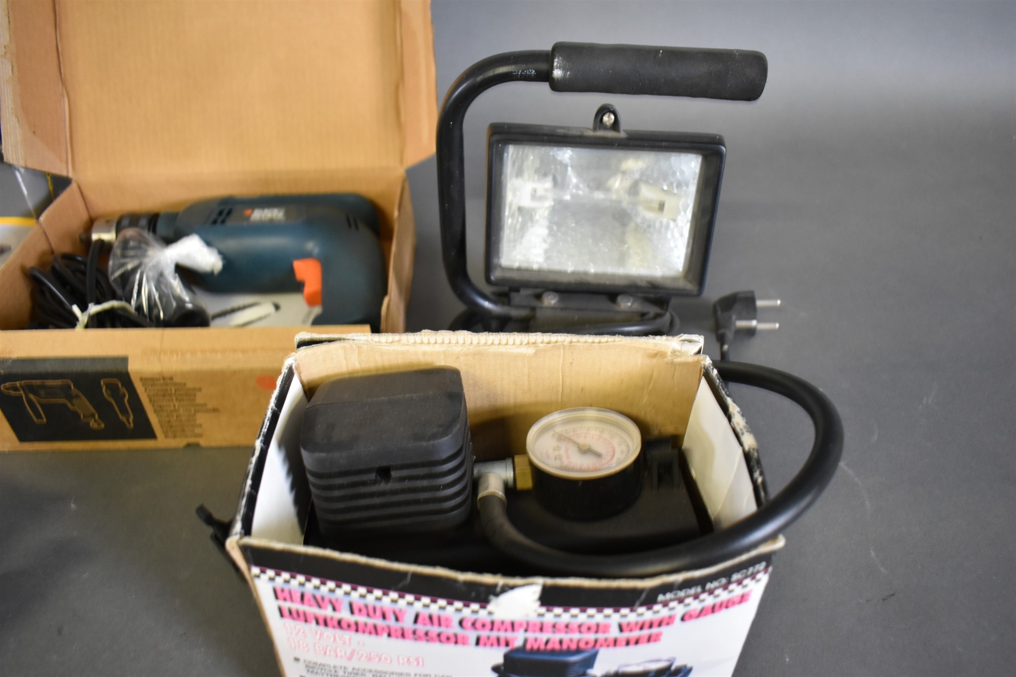 Parti elverktyg bla minikompressor (slang defekt) och slagborrmaskin