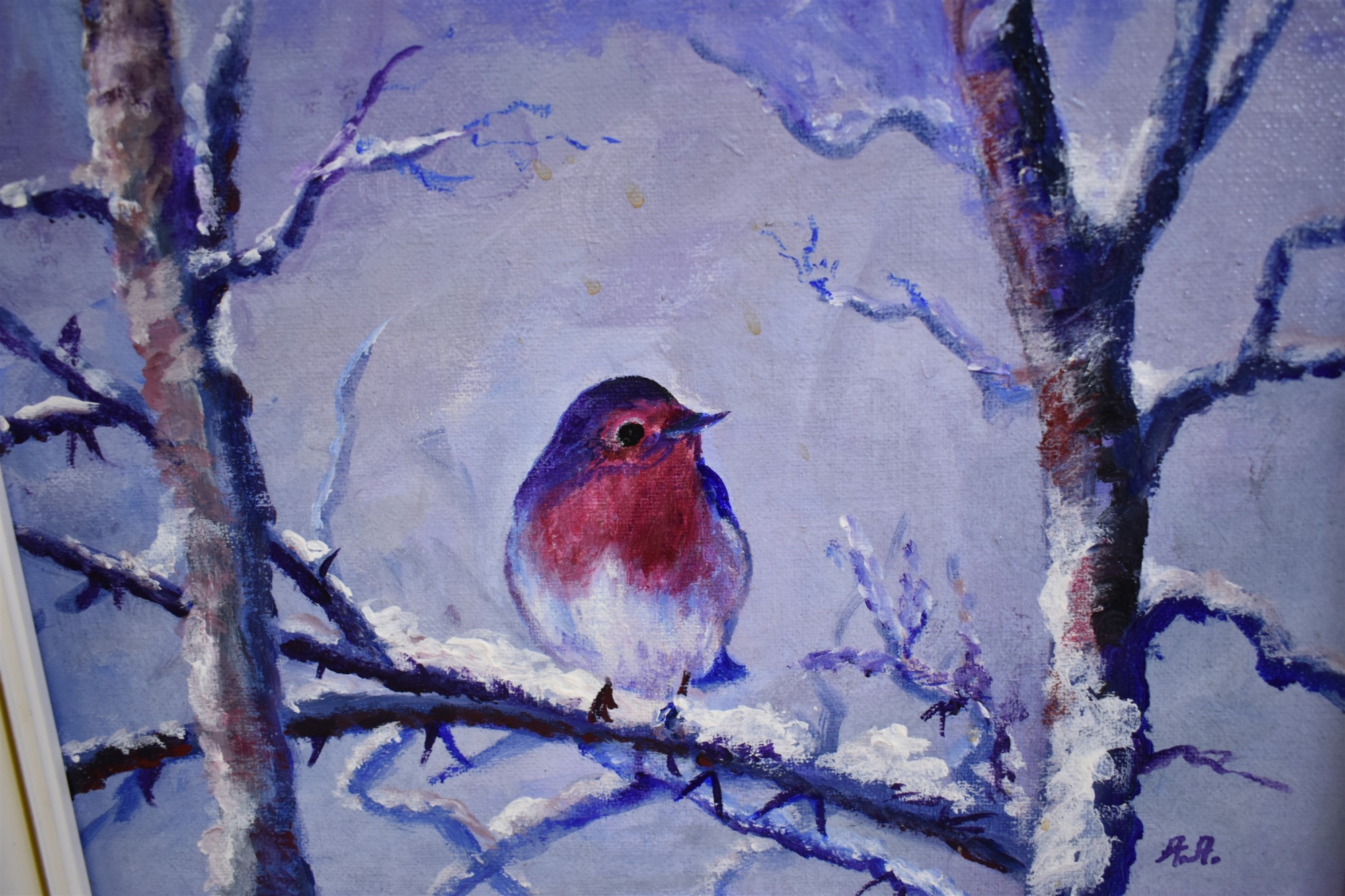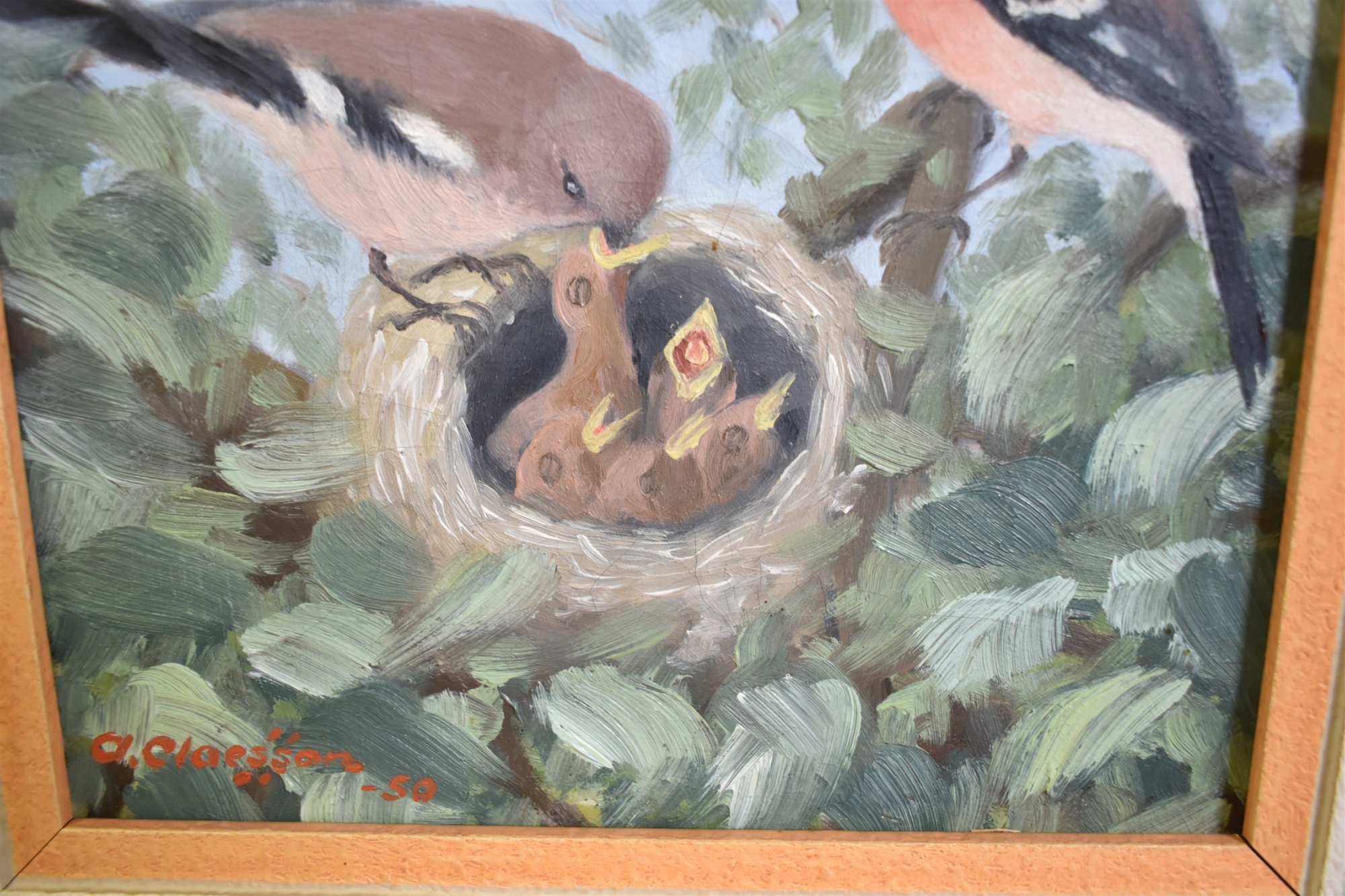 Bilder Claesson & monogramsignerad olja på duk 2 st, "Småfåglar" största mått 38 x 30 cm