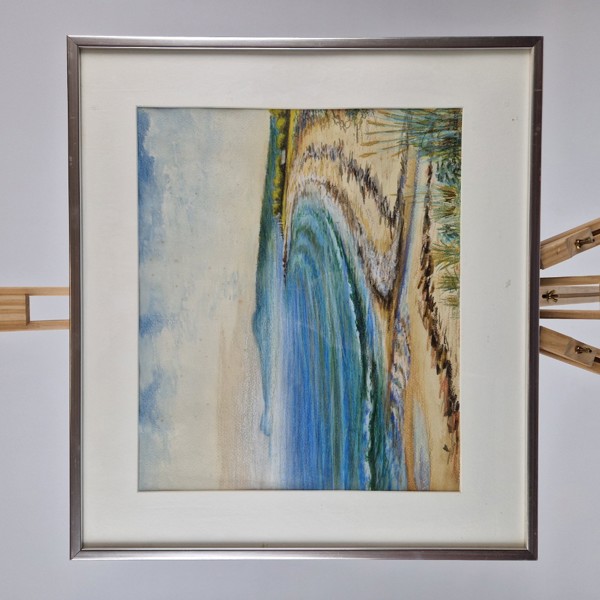Akvarell, motiv av Verkeåns mynning, Haväng, Gunnar Olsson, signerad och daterad 1958. Rammått 58,5 x 52,5 cm. Viss vågighet.