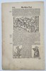This leaf is from "Das Dritte Buch" (The Third Book) of a 16th-century edition of the Cosmographia. It features three woodcut illustrations set within German Fraktur text. The main illustration is a topographical bird's-eye view of the fortified German city of Oettingen. Below this are two smaller woodcuts depicting local figures, including a priest, as described in the accompanying text.Sebastian Münster was a German cartographer, cosmographer, and scholar. He is best known as the primary author and editor of the Cosmographia, one of the most influential and commercially successful books of the 16th century. First published in 1544, this work provided a comprehensive description of the known world and was renowned for its extensive use of woodcut illustrations, including numerous city views and maps.