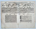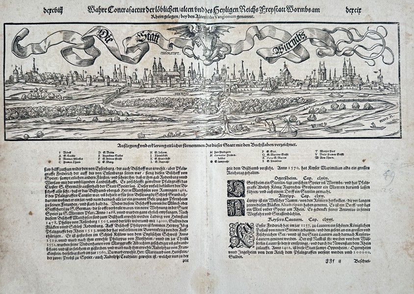 This large, double-page woodcut presents a detailed panoramic and topographical bird's-eye view of the city of Worms, Germany, identified in the title as "Wahre Contrafactur... der... Statt Wormbs" (True Likeness... of the City of Worms). The print captures the extensive city skyline, including its prominent cathedral, churches, and defensive walls, with the Rhine River ("Rhein flu.") flowing in the foreground. Below the image is a detailed key identifying numerous landmarks, and the image is surrounded by German Fraktur text describing the city's history.Sebastian Münster was a German cartographer, cosmographer, and scholar. He is best known as the primary author and editor of the Cosmographia, one of the most influential and commercially successful books of the 16th century. First published in 1544, this work provided a comprehensive description of the known world and was renowned for its extensive use of woodcut illustrations, including numerous city views and maps.