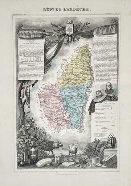 This topographical map depicts the Departement du Haut-Rhin, France (Upper Rhine), located in the Alsace region. The map itself shows the boundaries of the department's districts (arrondissements), which are highlighted in contrasting hand-coloring. The map is set within an elaborate decorative border characteristic of Levasseur's work, which includes allegorical and historical figures, a vignette of the department's coat of arms, a military scene, and extensive surrounding columns of text detailing the department's statistics and geography.Victor Levasseur was a French cartographer and engineer-geographer, active primarily in Paris during the mid-19th century. He is best known for his contribution to Atlases National et Departemental of France, an atlas of French departments that became famous for its highly decorative and artistic borders. Levasseur's work combined precise cartography with a wealth of information, making his maps both scholarly and visually appealing.