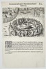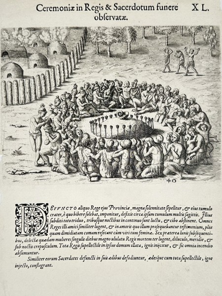 This ethnographic engraving illustrates a funeral ceremony of indigenous people, in the Americas. The scene depicts a large gathering of figures seated or kneeling in a circle around several vessels, suggesting a ritual or commemorative feast. In the background, a line of huts or tombs is visible, while two figures engage in a dance or display in the distance. The Latin title and the accompanying text describe the solemn rites and customs observed at the funeral of local rulers or priests.Theodor de Bry was an eminent Flemish engraver, goldsmith, and publisher, best known for his meticulous engravings that documented the early European voyages to the Americas. His massive illustrated work, the Grands Voyages (America), published from 1590 onward, contained some of the earliest and most widely disseminated images of indigenous American life and customs, based on the sketches and reports of explorers.