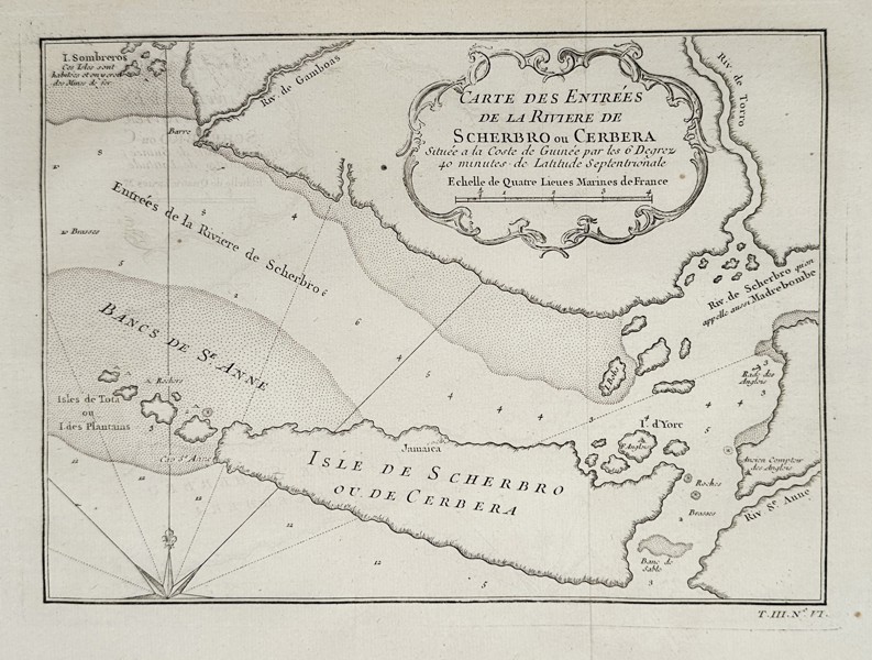 This hydrographic chart is titled Carte des Entrées de la Rivière de Scherrebro et Cerbera (Chart of the Entrances to the Scherrebro and Cerbera Rivers). The map depicts a coastal area, an island (Isle de Scherbero ou de Cerbera), and the intricate river mouths and sandbanks (Bancs de St. Anne) near the equator. The map includes soundings and navigational details crucial for maritime travel, characteristic of an 18th-century French nautical chart. The cartouche containing the title is ornately framed in the Rococo style.Jacques-Nicolas Bellin was a preeminent French hydrographer and geographer of the 18th century. He served as the official hydrographer for the French Navy and was a member of the French Académie des Sciences. Bellin produced an immense and critically acclaimed body of accurate maps and charts, contributing to major geographical publications, including his own multi-volume Petit Atlas Maritime, from which this chart originates.