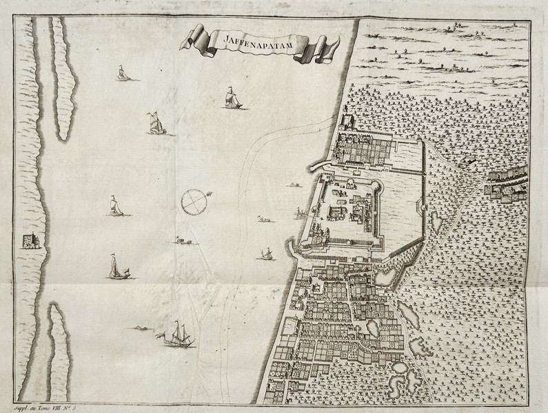 This topographical city plan is titled Jaffnapatam (Jaffna), depicting the fortified city located in northern Ceylon (Sri Lanka). The map illustrates the city's coastal position and its strategic defenses, including the prominent fort built during the colonial period. The urban area is shown extending along the shore, backed by extensive surrounding lands. Several ships are shown anchored in the roadstead.Jacques-Nicolas Bellin was a preeminent French hydrographer and geographer of the 18th century, serving as the official hydrographer for the French Navy and the Royal Academy of Sciences. Bellin produced an immense and critically acclaimed body of accurate maps and charts, contributing views and plans to major geographical publications, including Histoire Générale des Voyages by Abbé Prévost, from which this plate originates.