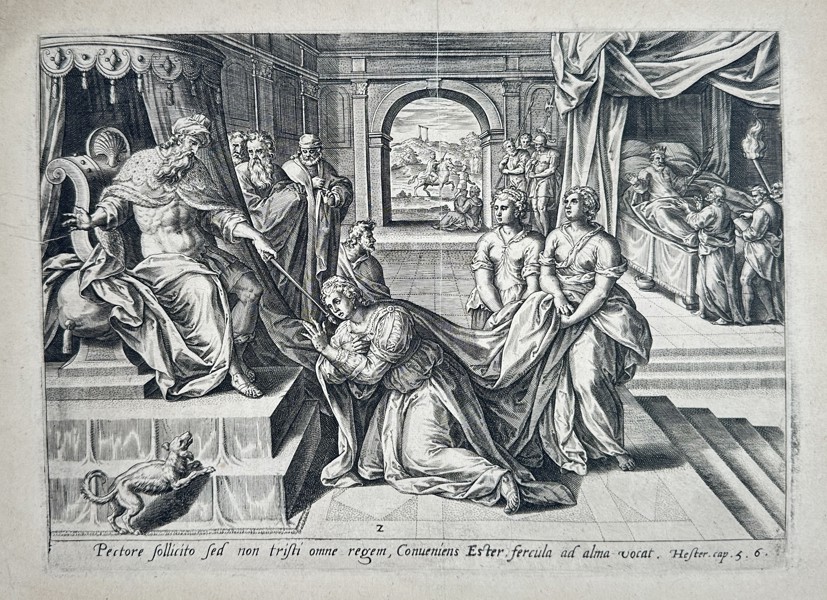 This biblical engraving depicts the scene of Esther Before King Ahasuerus, a pivotal moment from the Old Testament Book of Esther. The scene is set in an elaborate Renaissance palace interior. Queen Esther is shown kneeling before the enthroned King Ahasuerus, who extends his scepter toward her. She is supported by her maidservants, while royal guards and other figures observe the interaction. The image dramatically captures the moment when Esther risks her life to save her people.Jan Collaert I was a Flemish draughtsman, engraver, and publisher, who established a prominent workshop in Antwerp during the second half of the 16th century. He was a highly influential figure in the Dutch Golden Age print trade, producing a large volume of meticulous engravings based on the designs of leading artists of his day, often specializing in biblical, allegorical, and mythological subjects.